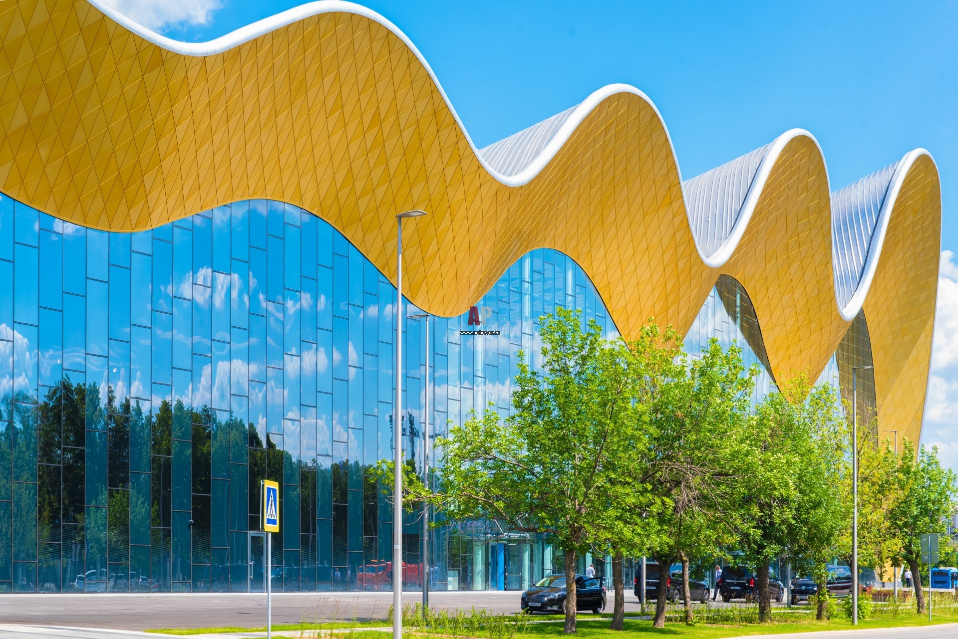 Центральный фасад имеет витражное остекление, он приглашает гостей заглянуть внутрь, в многоуровневое фойе.