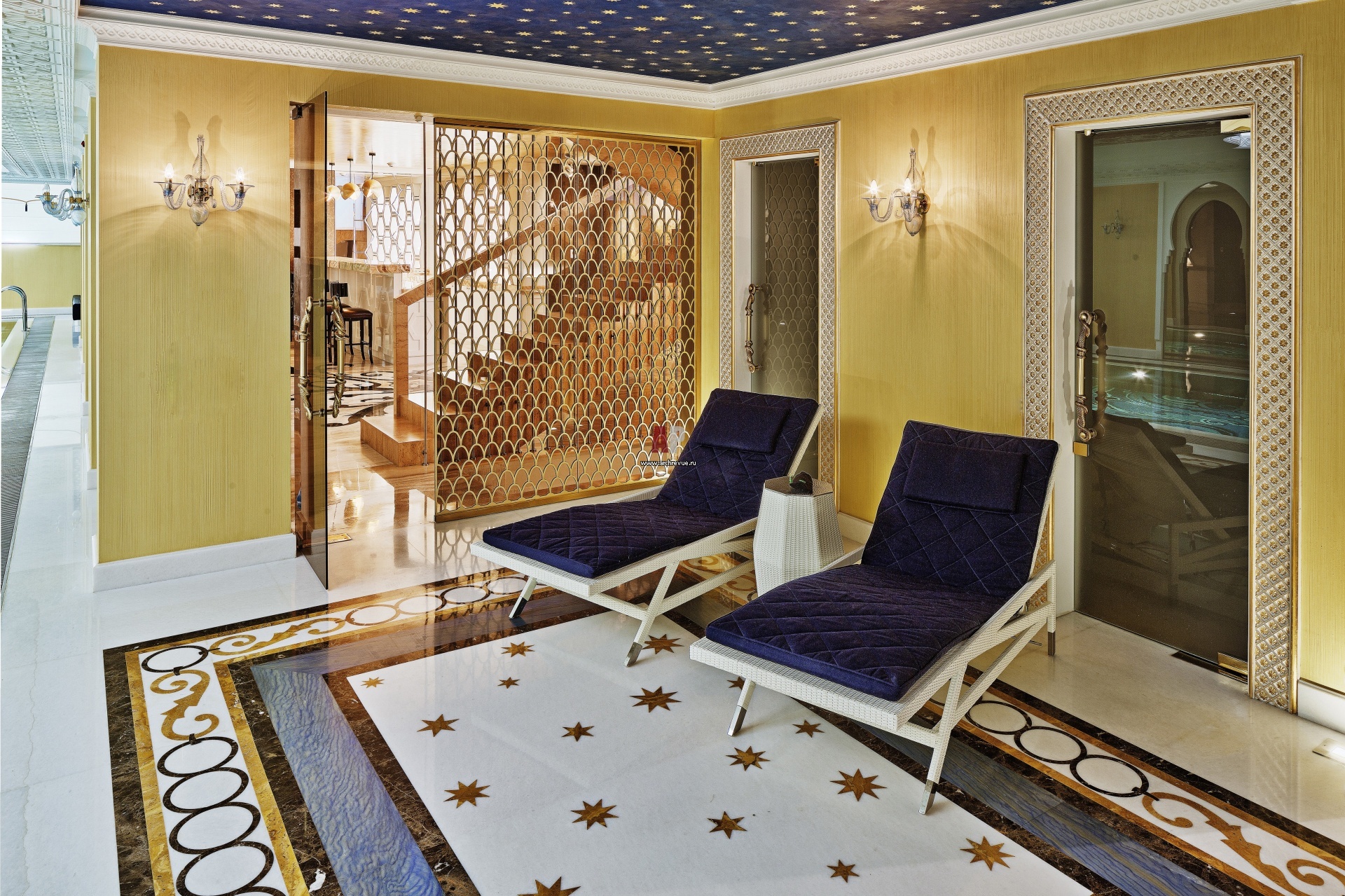 Зона SPA оформлена в роскошном восточном стиле. Золотая колористика усилена ультрамариново-синей мозаикой.