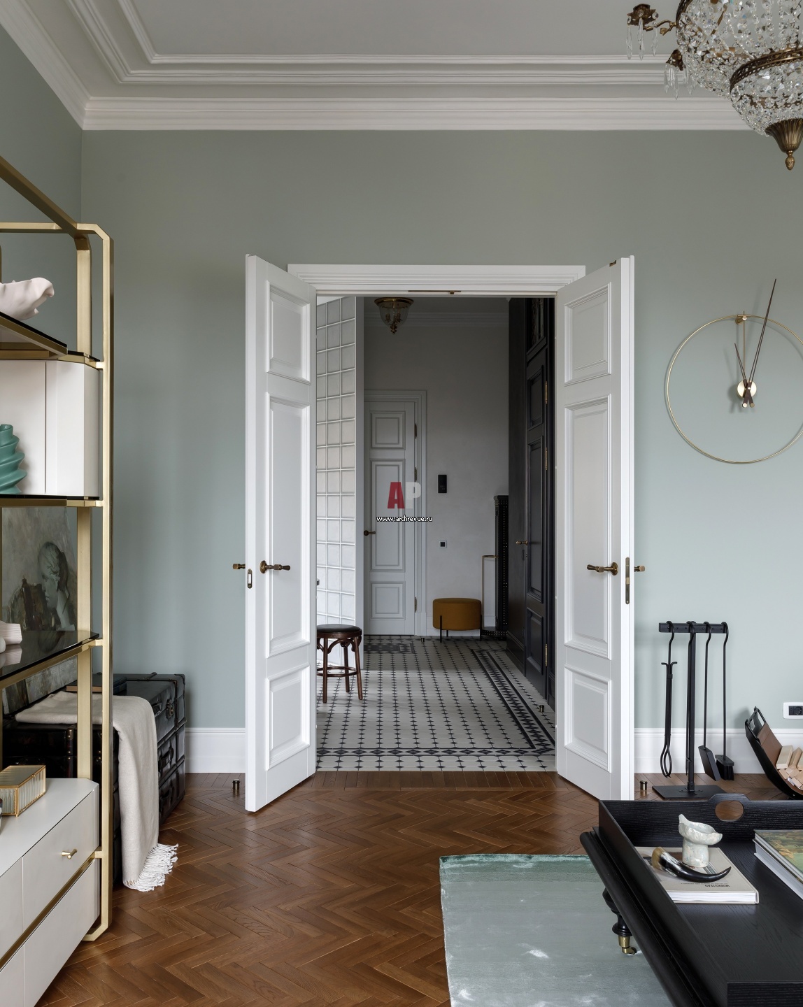 Гостиная. Вид на прихожую. Межкомнатные двери распашные, белая эмаль. Стеллаж из латуни современный, изготовлен на заказ.