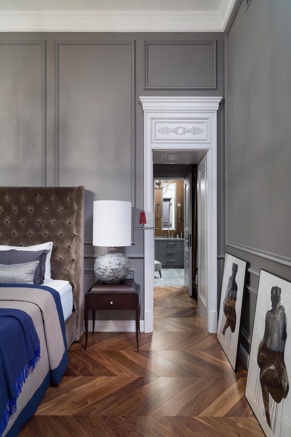 К хозяйской спальне примыкает ванная комната. Классические двери с резными порталами изготовлены на заказ по эскизам дизайнеров компанией «Столичная Столярная Компания». Высота дверей вместе с порталом – 3200 мм. Материал: МДФ и массив древесины, украшение портала – резьба по дереву.