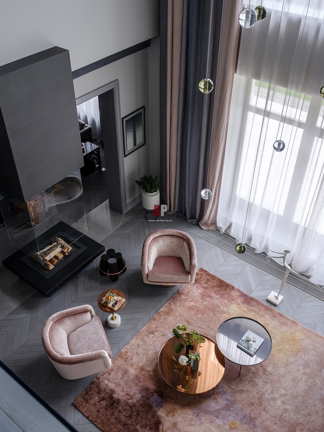 Высота двухсветной гостиной составляет 12 м. Интерьер выполнен в серой гамме с использованием приятных на ощупь фактур.