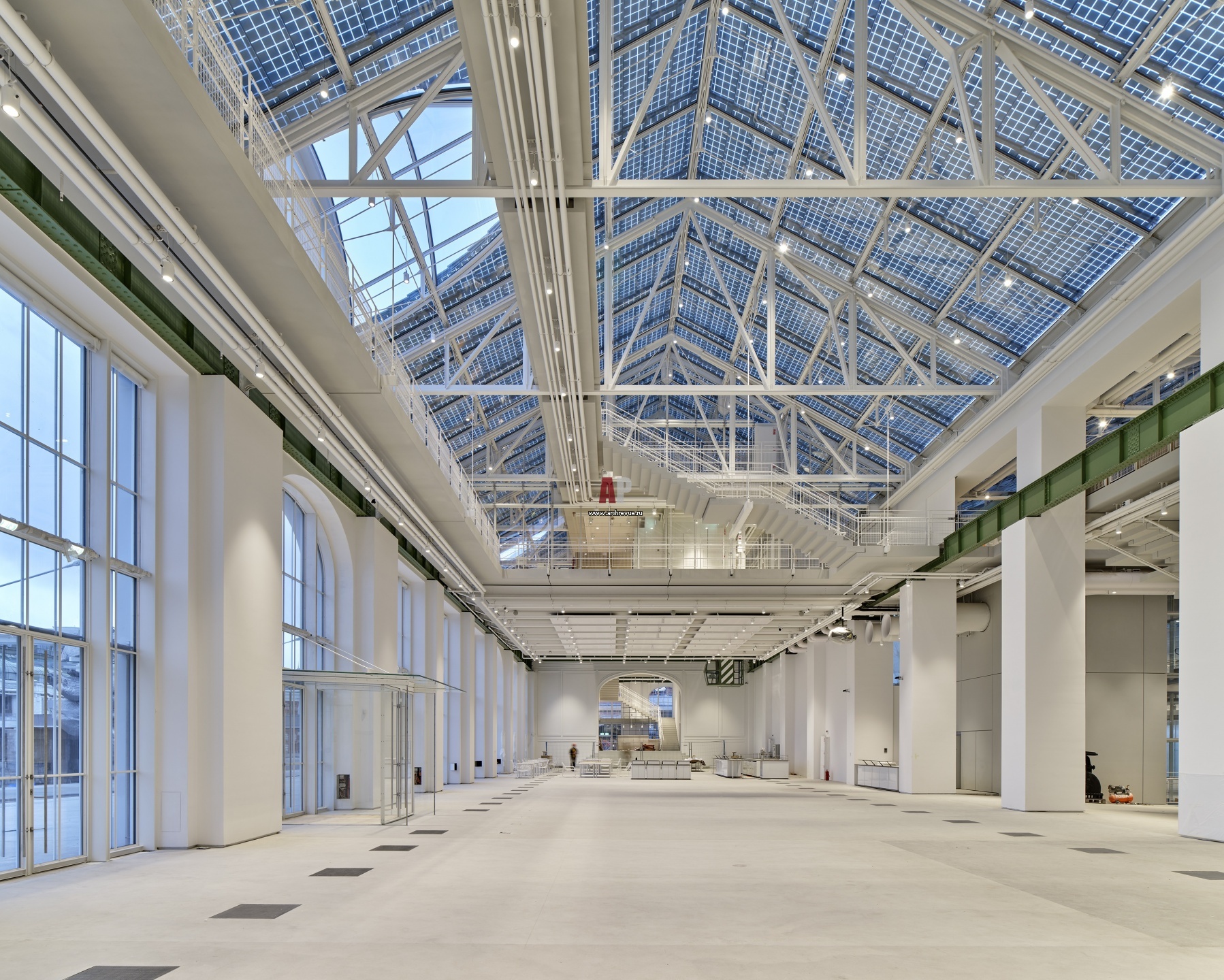Внутри здания – единое свободное пространство с открытыми несущими конструкциями и инженерными системами.