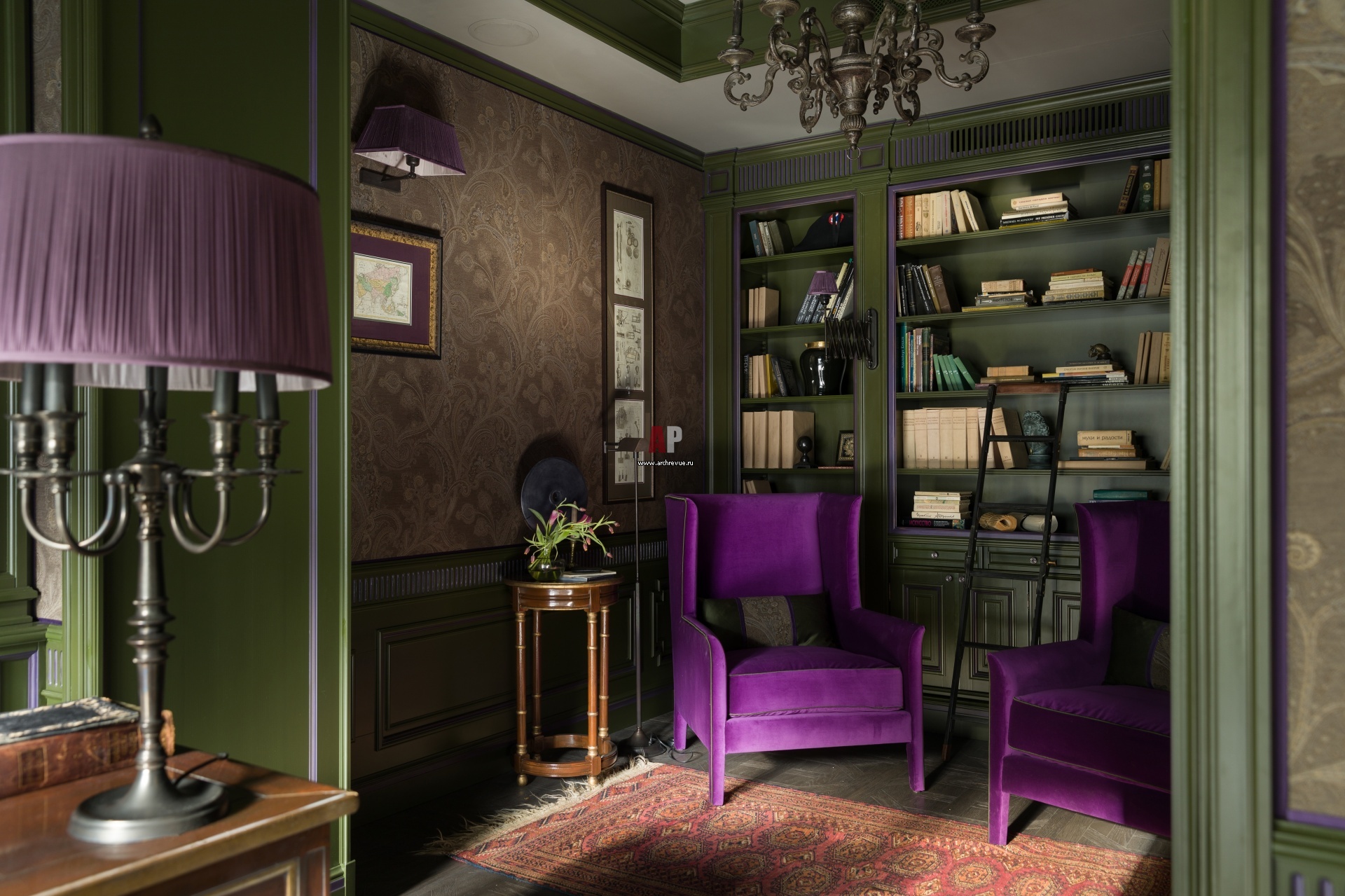 Зона библиотеки в кабинете. Стеллажи, встроенные шкафы, стеновые панели изготовлены на заказ. Мебель, Yves Fouquet, JNL.