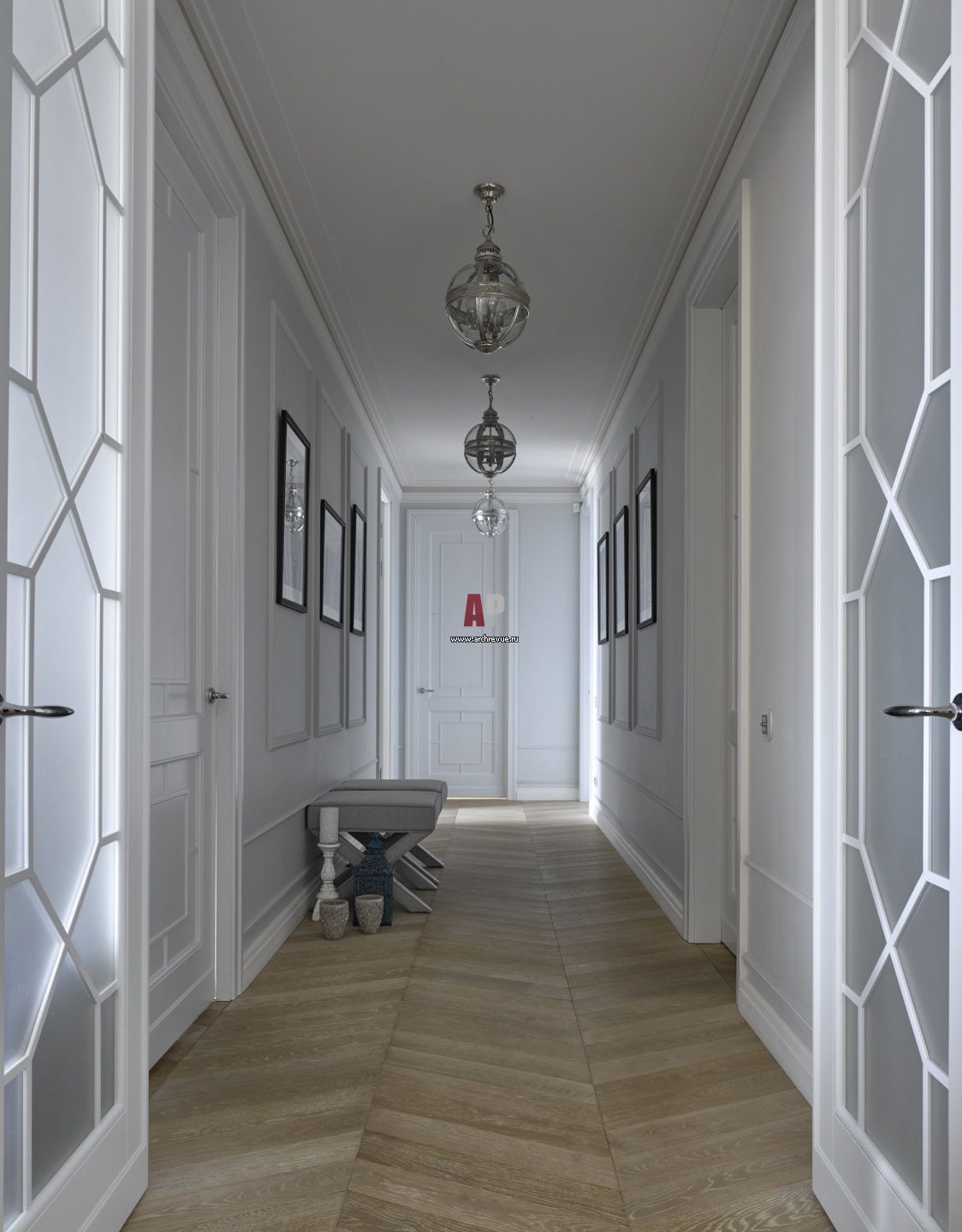 Белые двери с неоклассической раскладкой и стеклянными витражами сделаны по эскизам авторов проекта, изготовление «Ассоциация русских мастеров».