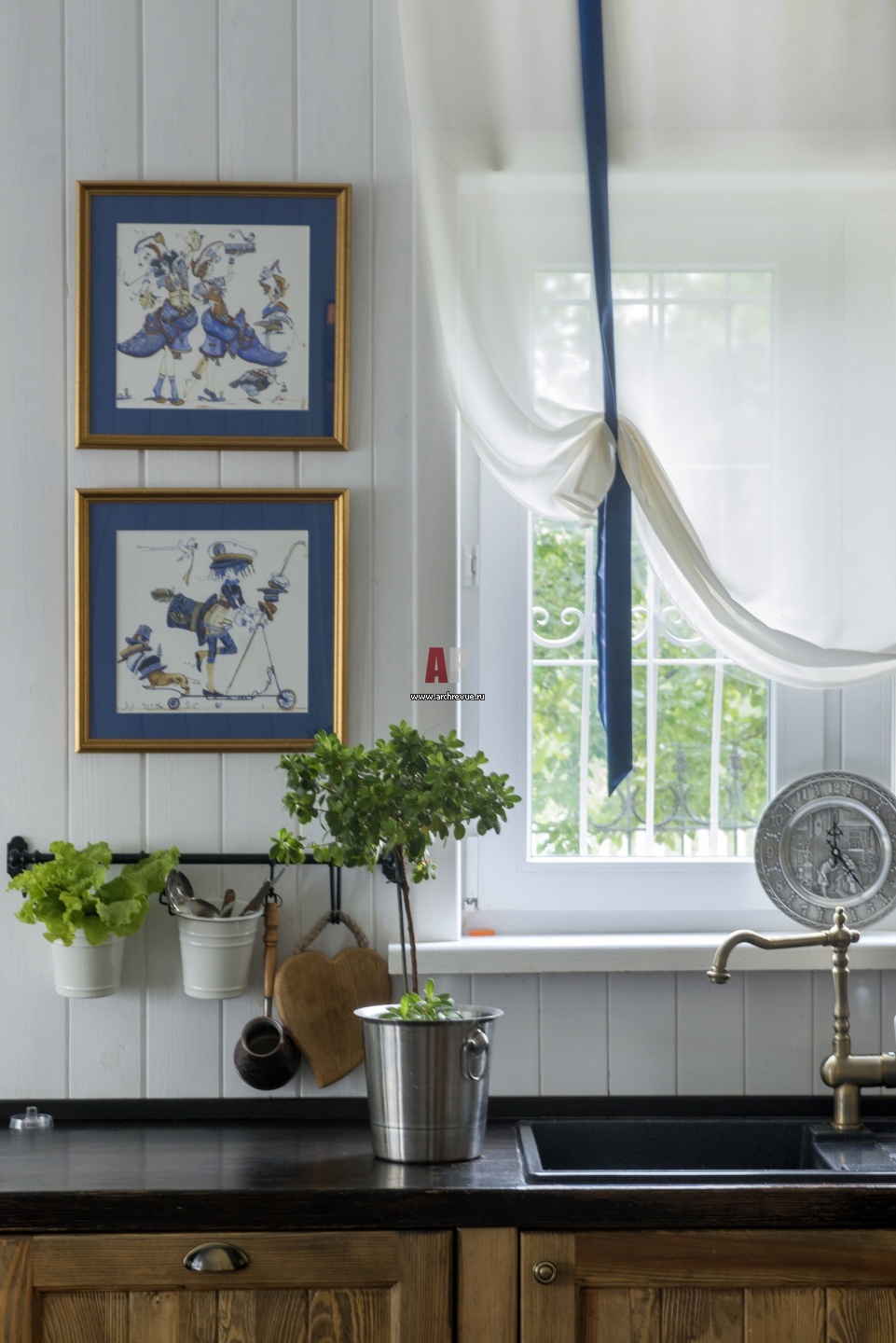 Мойка размещена под окном. Медные смесители в винтажном стиле добавляют интерьеру исторической достоверности.