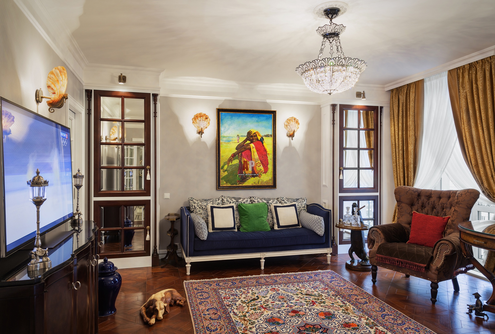 Дизайн гостиной с нотами французского дворцового стиля. Конструктивные особенности помещения обыграны как композиция из встроенных шкафов с зеркальными фасадами. За одним из них скрывается несущий элемент, за другим находится встроенный шкаф-библиотека.