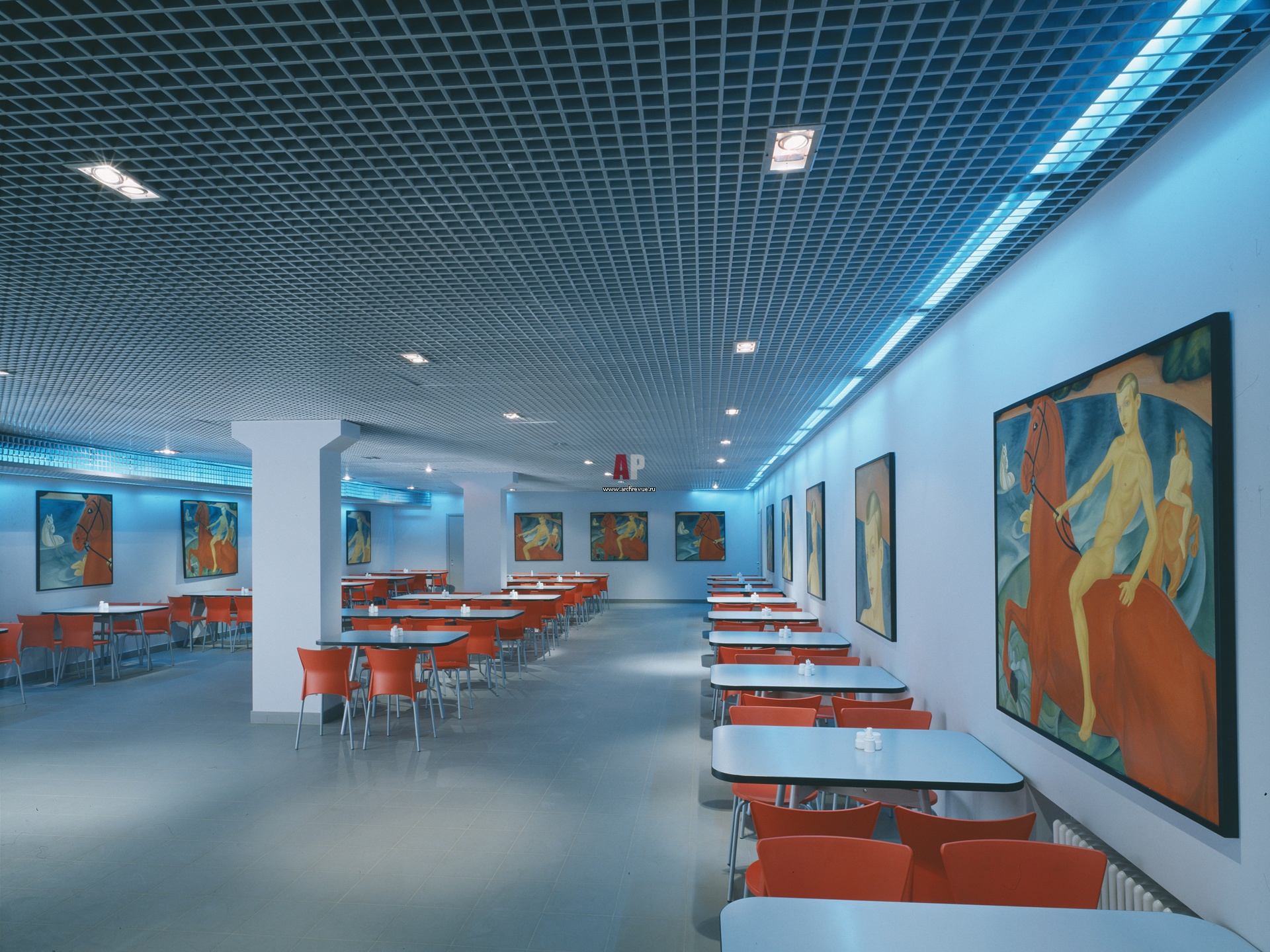 Ресторан с баром размещаются в цоколе офисного центра. Как и во всех пространствах этого комплекса, автор использует характерные приемы оформления - красный цвет, определяющий все акценты, не тривиальное освещение и металлические сетки на потолках, поставщик «Инвест групп».