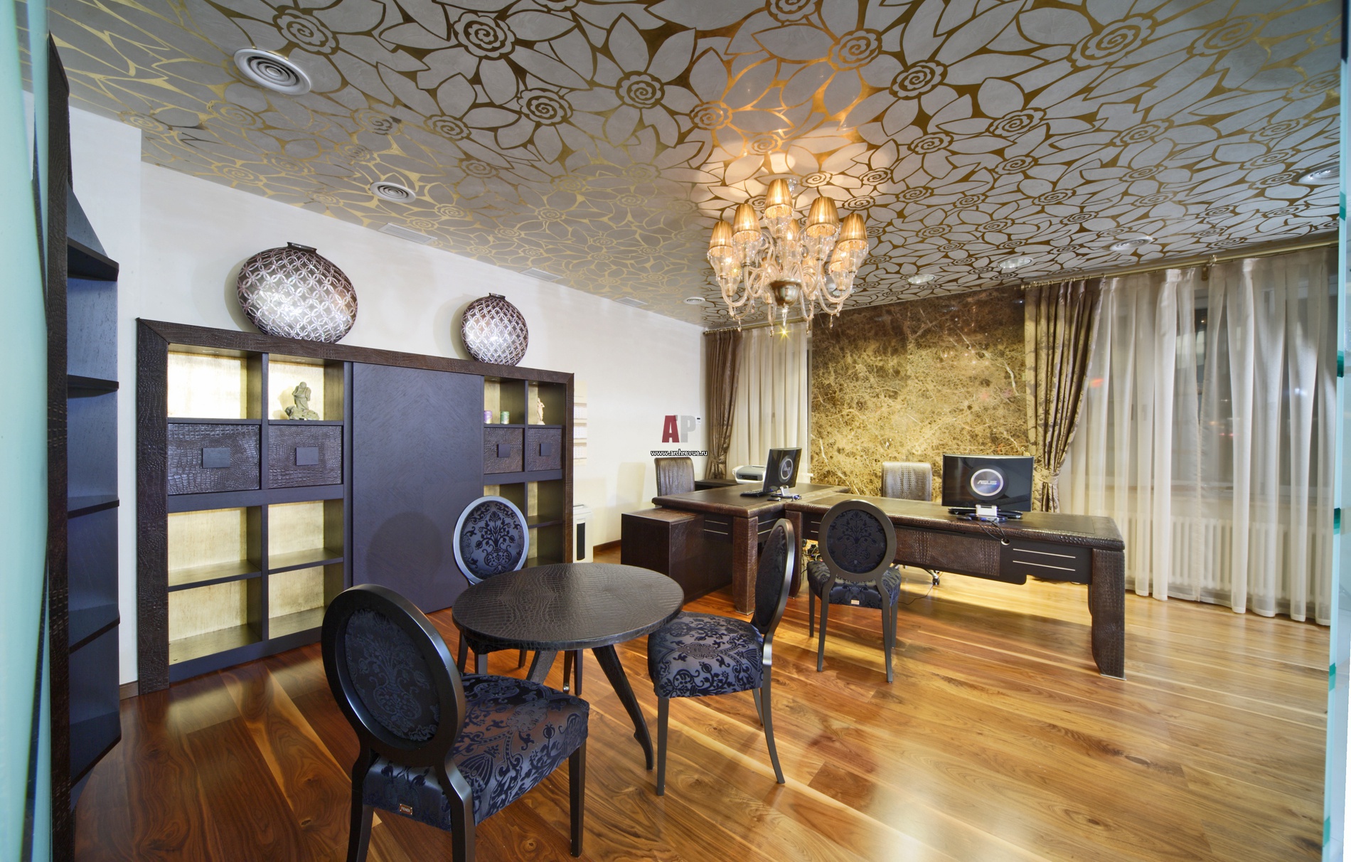 Кабинет руководства исполнен в духе ар-деко. Стена облицована слэбом из мрамора сорта «Имперадор». Потолки декорированы росписью с позолотой. Мебель Smania выполнена из ценных пород дерева и обтянута кожей рептилий.