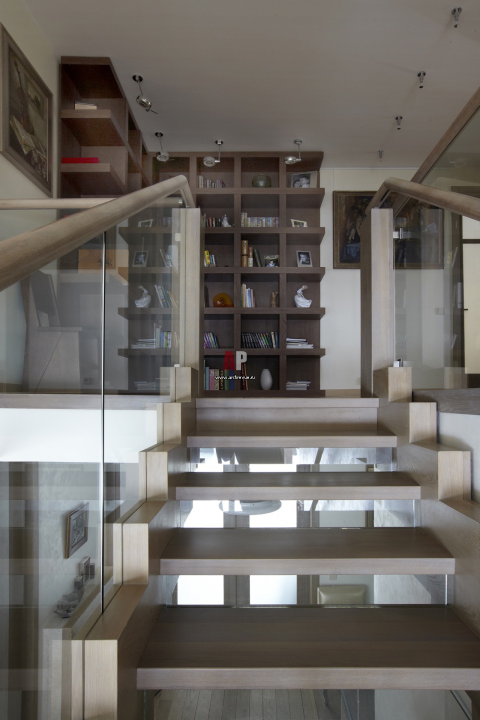 Библиотека находится в холле второго этажа. Современные стеллажи из темного дерева сделаны на заказ по чертежам архитектора под размеры помещения.