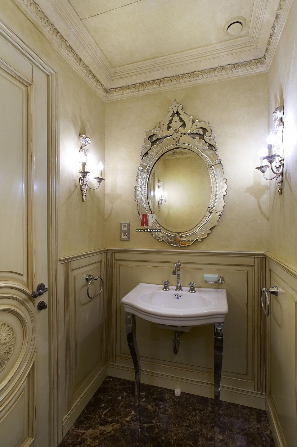 Интерьер гостевого санузла в классическом стиле. Низ стен отделан деревянными буазери теплого сливочно-кофейного цвета. Умывальник, Devon & Devon.
