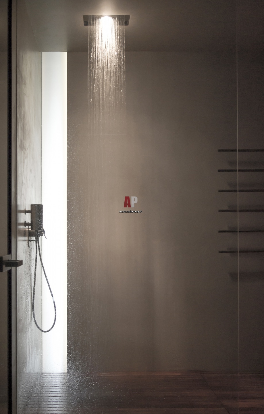 Фото душевой с тропическим душем. Стены бетонные, полы тиковые.