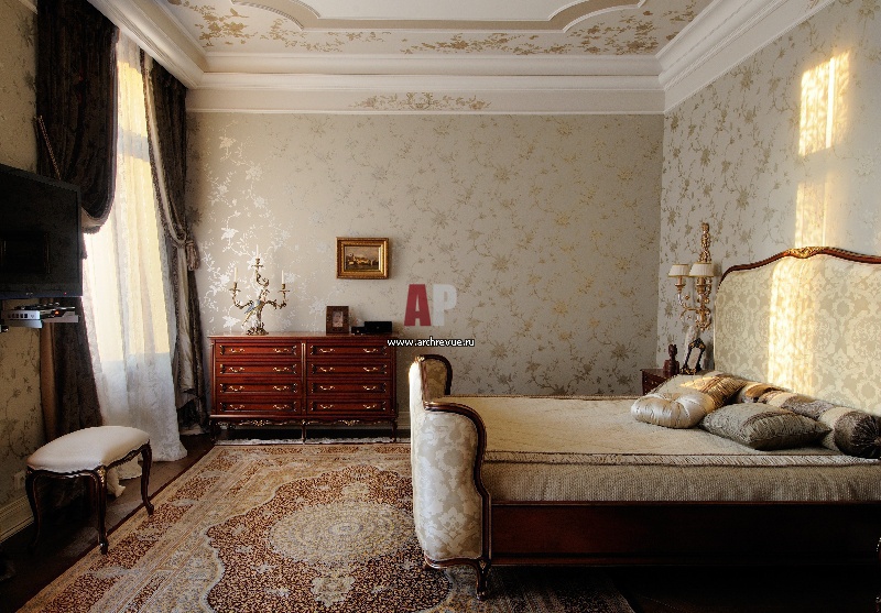 Спальня хозяина двухуровневая: в нижней части расположен малый кабинет, выше уровнем – пространство кровати. Декоративные росписи потолка Елена Гричаненко, Елена Угольникова, Павел Попов. Текстиль Евгения Богатырёва, компания Mobile Line Décor.