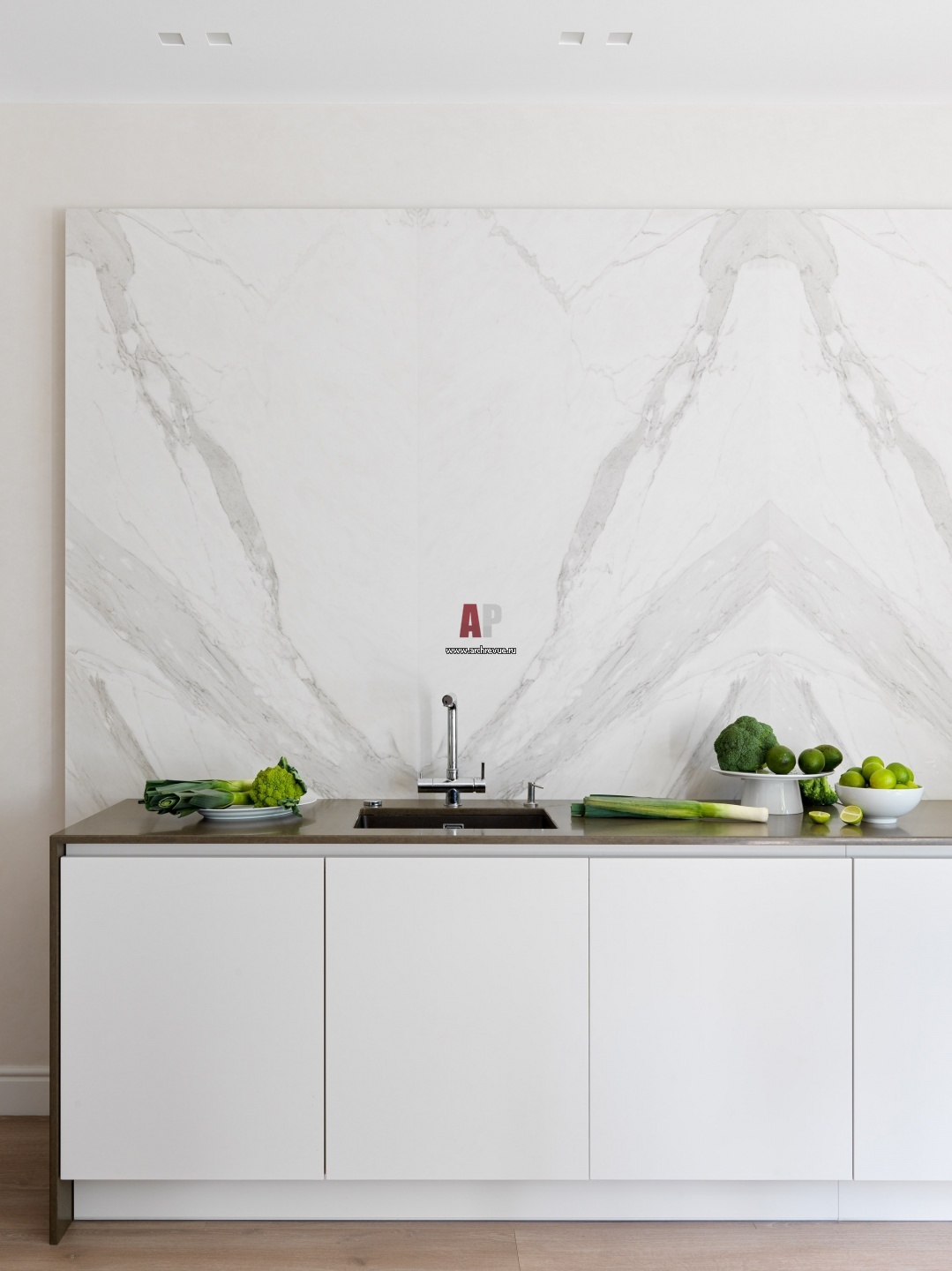 Очень интересно оформлена кухня. Чтобы не загромождать пространство, дизайнеры решили отказаться от навесных кухонных шкафов и вместо них сделать каменное панно с активным рисунком мрамора Calacatta – своего рода увеличенный в размерах кухонный фартук. Для большего эффекта по периметру конструкция подсвечена светодиодной лентой.