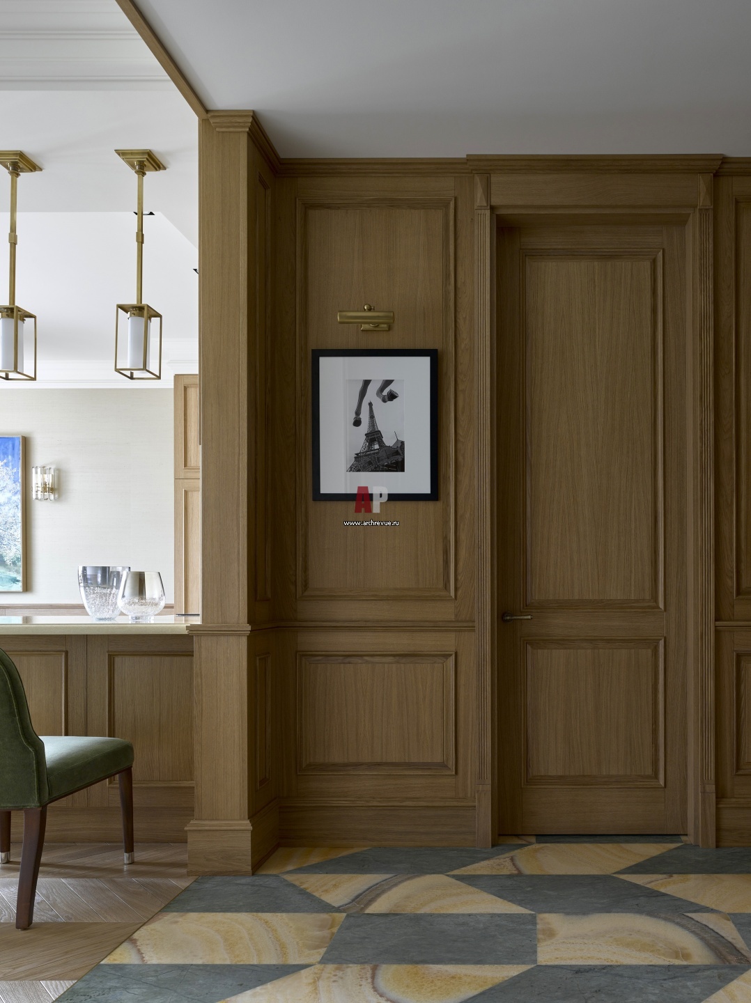 Интерьер квартиры с деревом и камнем. На полу – мозаика из разных сортов мрамора и оникса с теплой палитрой. Стены оформлены дубовыми буазери, среди них прочти незаметна дверь в гардеробную для верхней одежды.