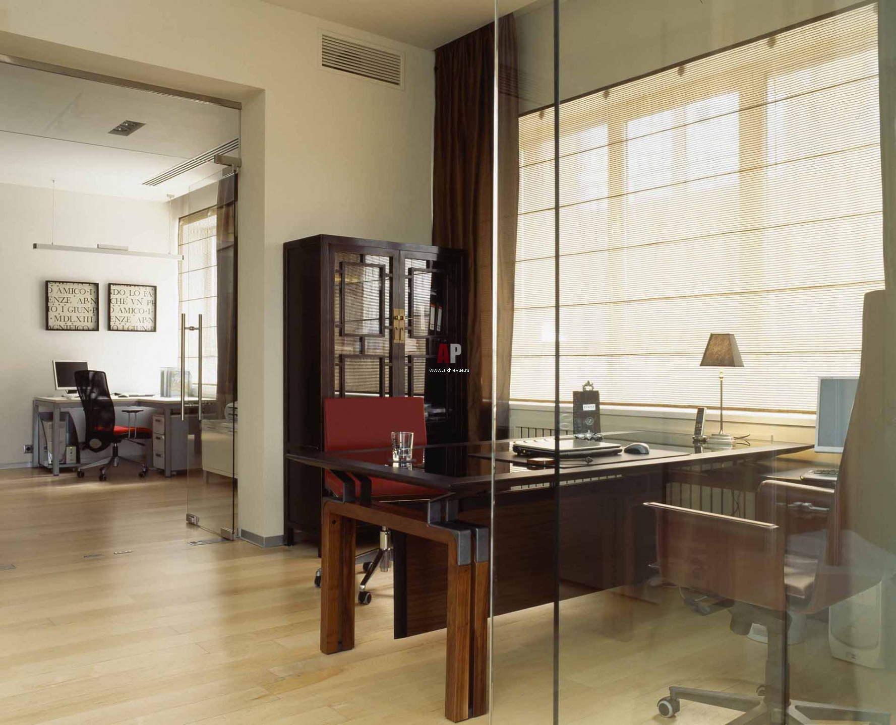 Фото интерьера офиса в стиле фьюжн. Большие окна, как и полы из светлого клена, поставщик «Мир Паркета», добавляют в помещения света.