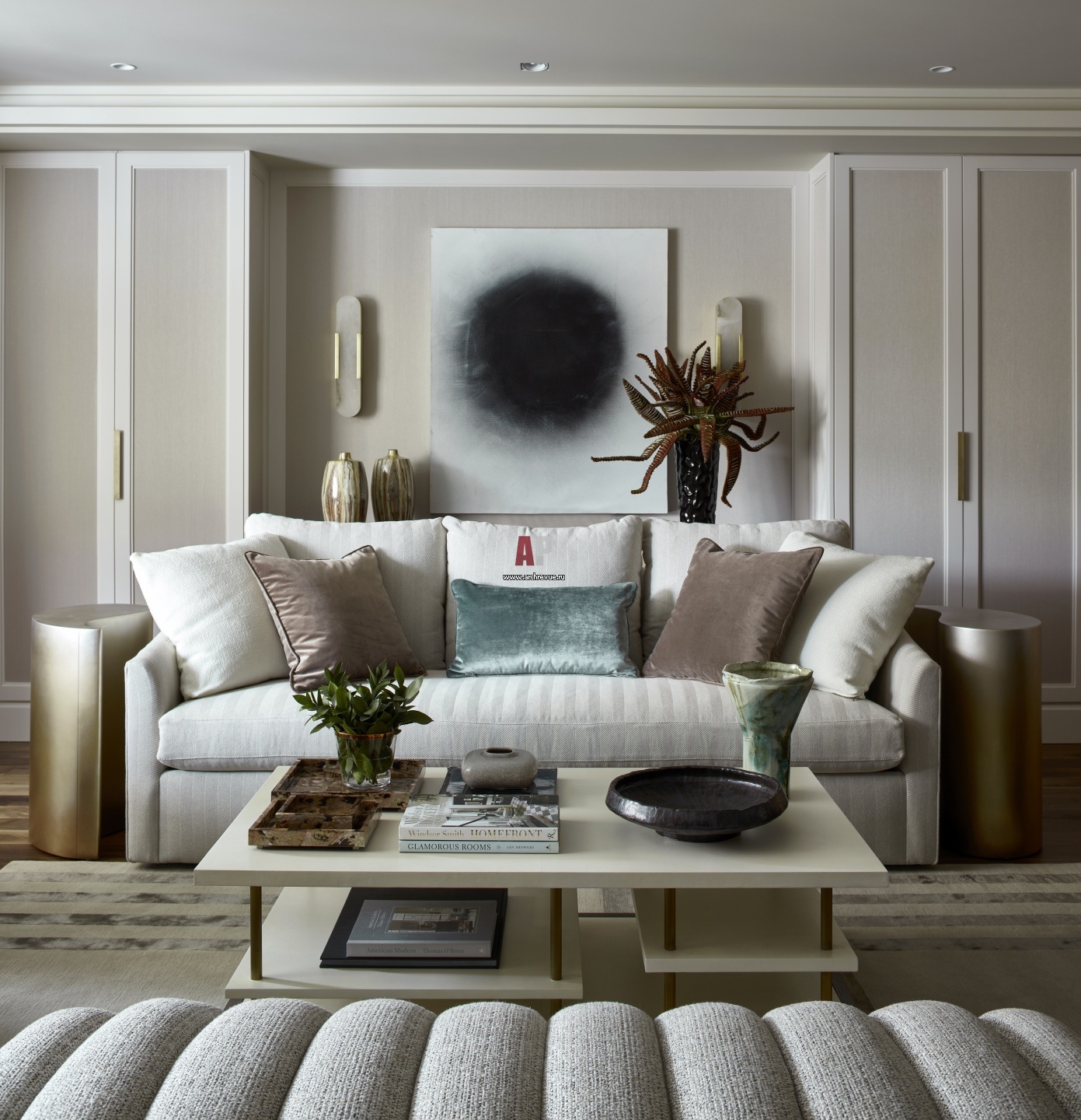 Зона отдыха в гостиной. Единообразная светлая цветовая гамма, вертикальное членение стен с помощью стеновых панелей и встроенной мебели призваны визуально увеличить высоту помещения. Живопись, художник Татьяна Клят.