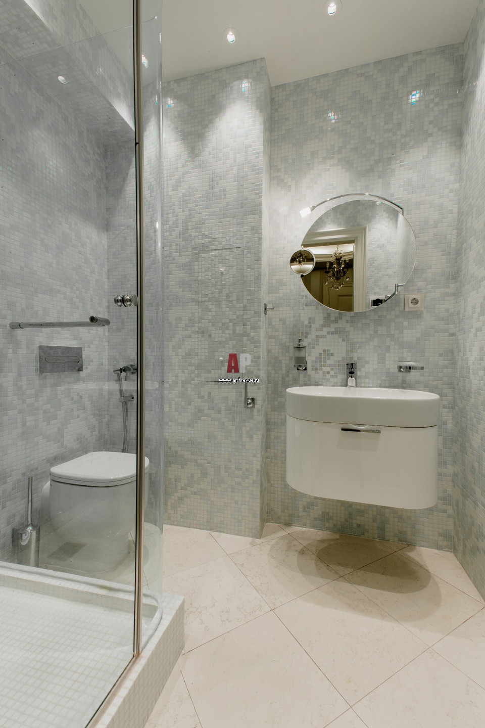 Интерьер гостевого санузла в серебристо-голубой цветовой гамме. На стенах – стеклянная мозаика, на полу – крупная плитка из травертина. Душевая кабина из стекла, в строительном исполнении.