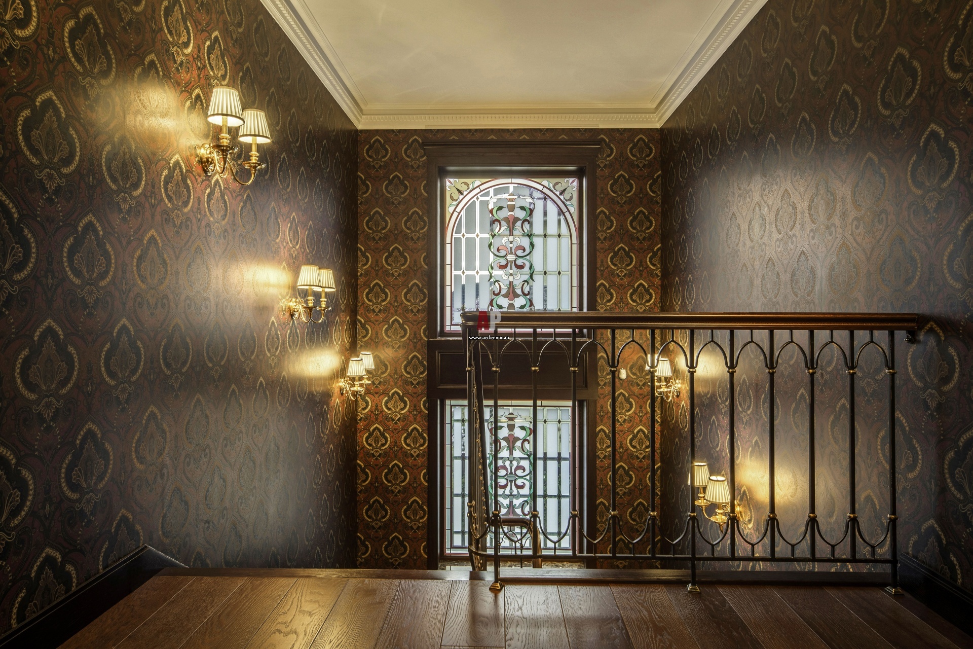 Холл второго этажа с лестницей. Панорамное окно оформлено витражом, оно создает викторианскую атмосферу и обеспечивает приватность в поселке с плотной застройкой.