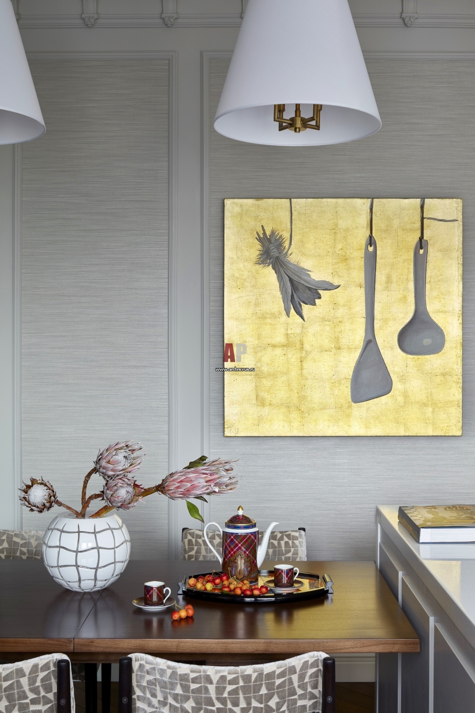 Стены в зоне столовой выкрашены в серый цвет и оформлены панно из текстильных обоев в обрамлении гипсовых молдингов. Картина – Иван Коршунов.