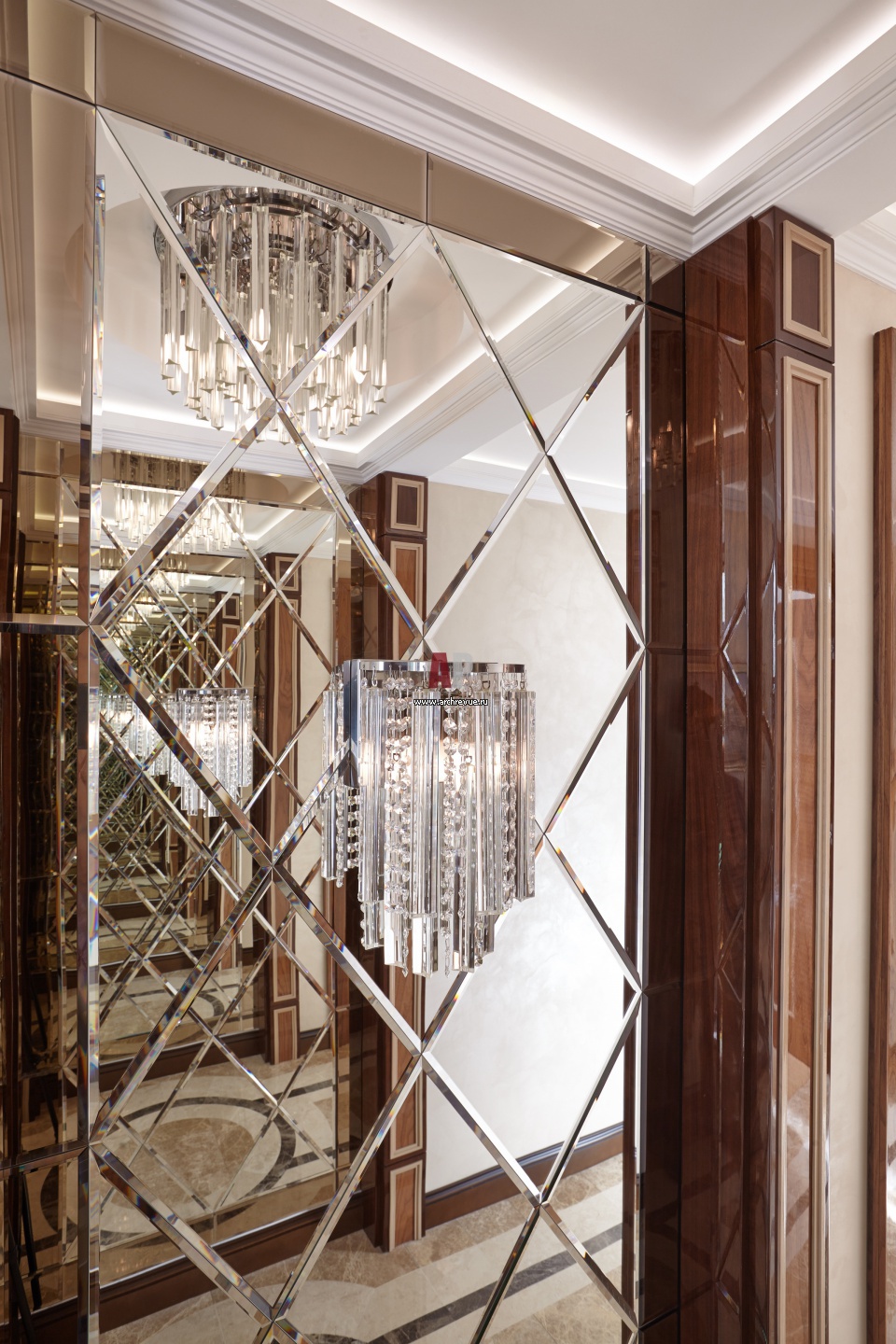Зеркальные панели с фацетом зрительно расширяют помещение коридора. Светильники и бра сделаны из стандартных элементов, но по индивидуальным размерам и рисунку на фабрике Il Paralume Marina.