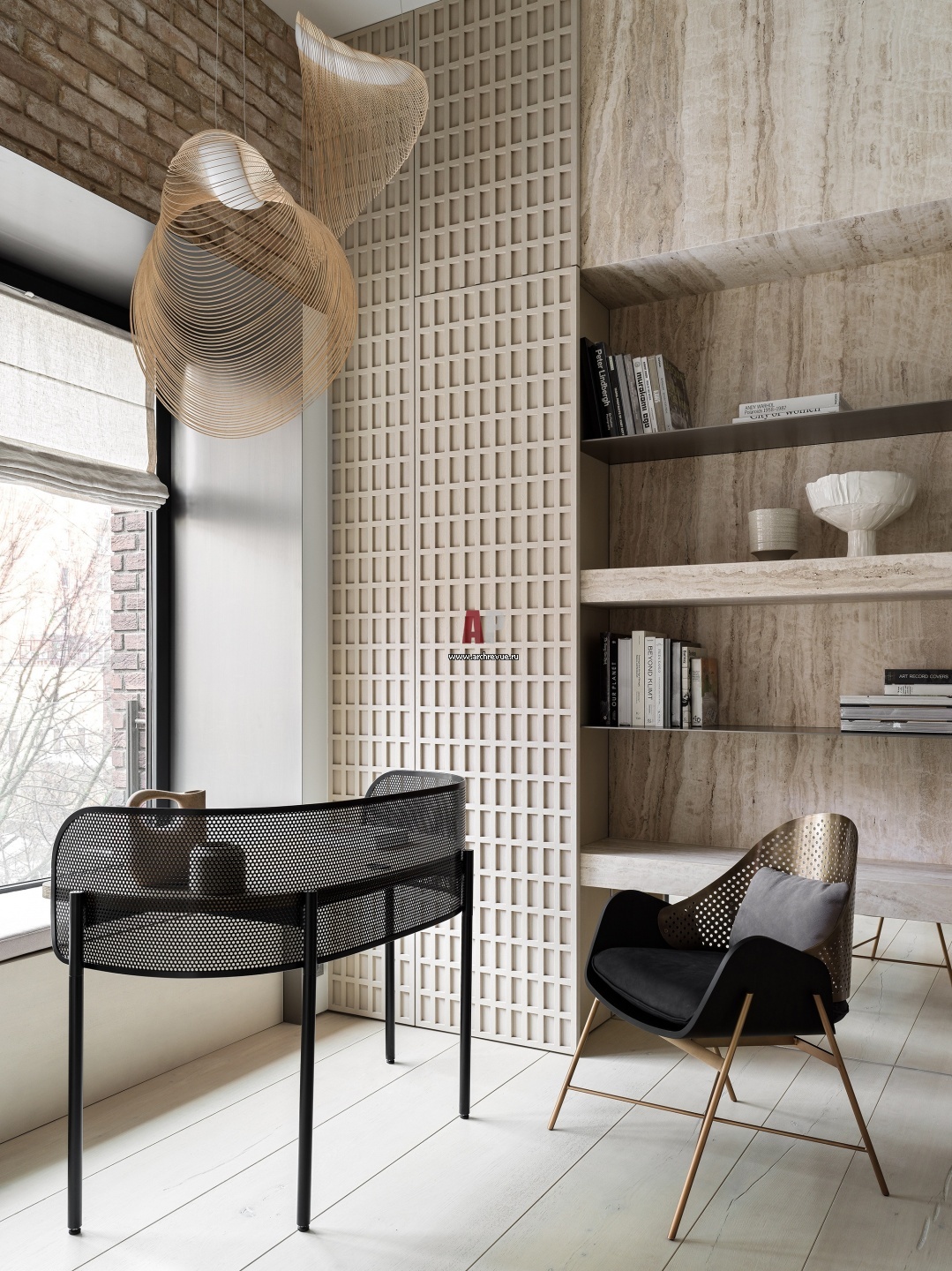 Кабинет. Рабочий стол Northern, модель Shelter. Светильники Luceplan, модель Illan. Вокруг окна – шлифованная сталь. Все деревянные элементы в интерьере выполнены в отделке радиальным шпоном дуба. Полки облицованы матовым лощеным травертином.