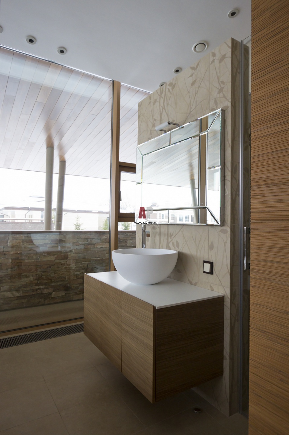 На перегородке, к которой смонтирован умывальник, изображены деревья. Подстолье раковины из шпона ореха.