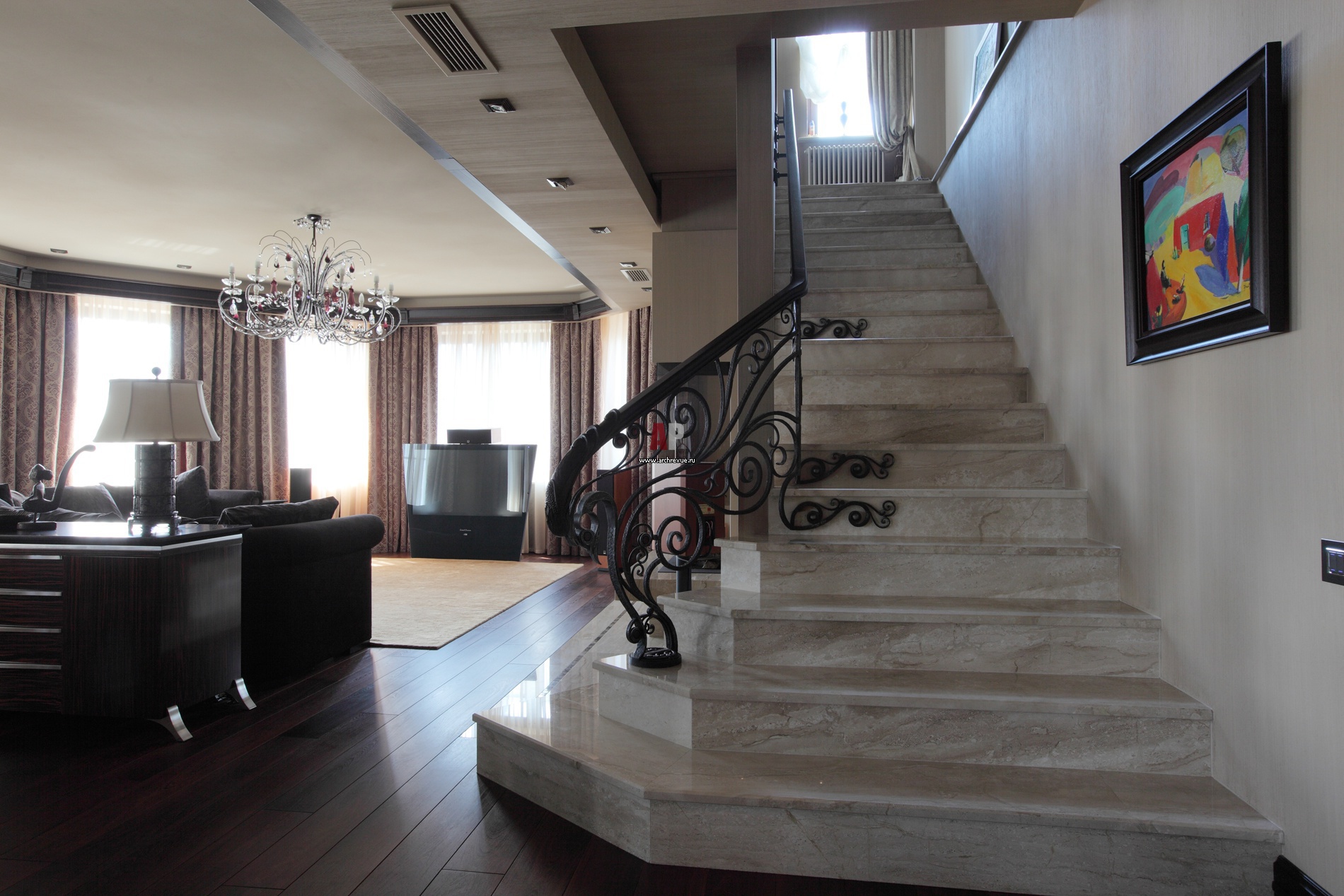 Кованые перила лестницы выполнены кузнецами мастерской «Сварог-Арт» и патинировались на месте. Орнамент перил рифмуется с росписью купольного потолка на втором этаже. Металлические вензеля, заходящие сбоку под ступени, выполняют роль дополнительных опорных элементов. На ступенях – мрамор, поставщик «АРДО».