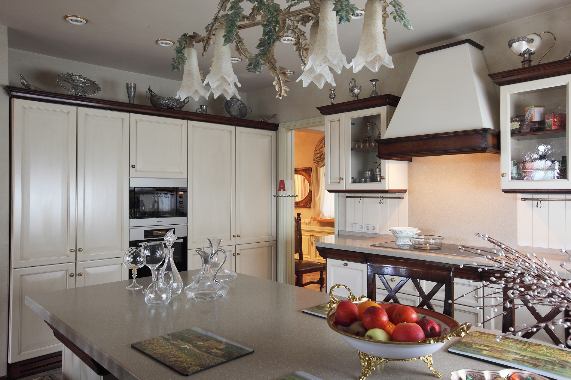 Интерьер кухни дома в стиле неоклассика. Над барной стойкой – светильник из цветного стекла в виде полураскрытых бутонов цветов.