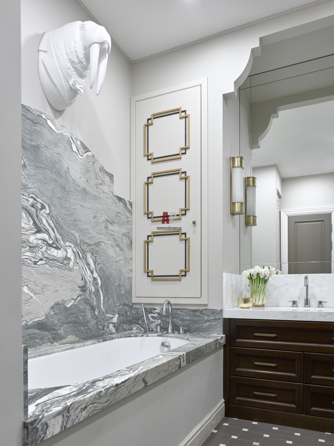 Главный декоративный акцент спальни – панно из слэба мрамора светлого серого цвета. Над ним – голова моржа из гипса.