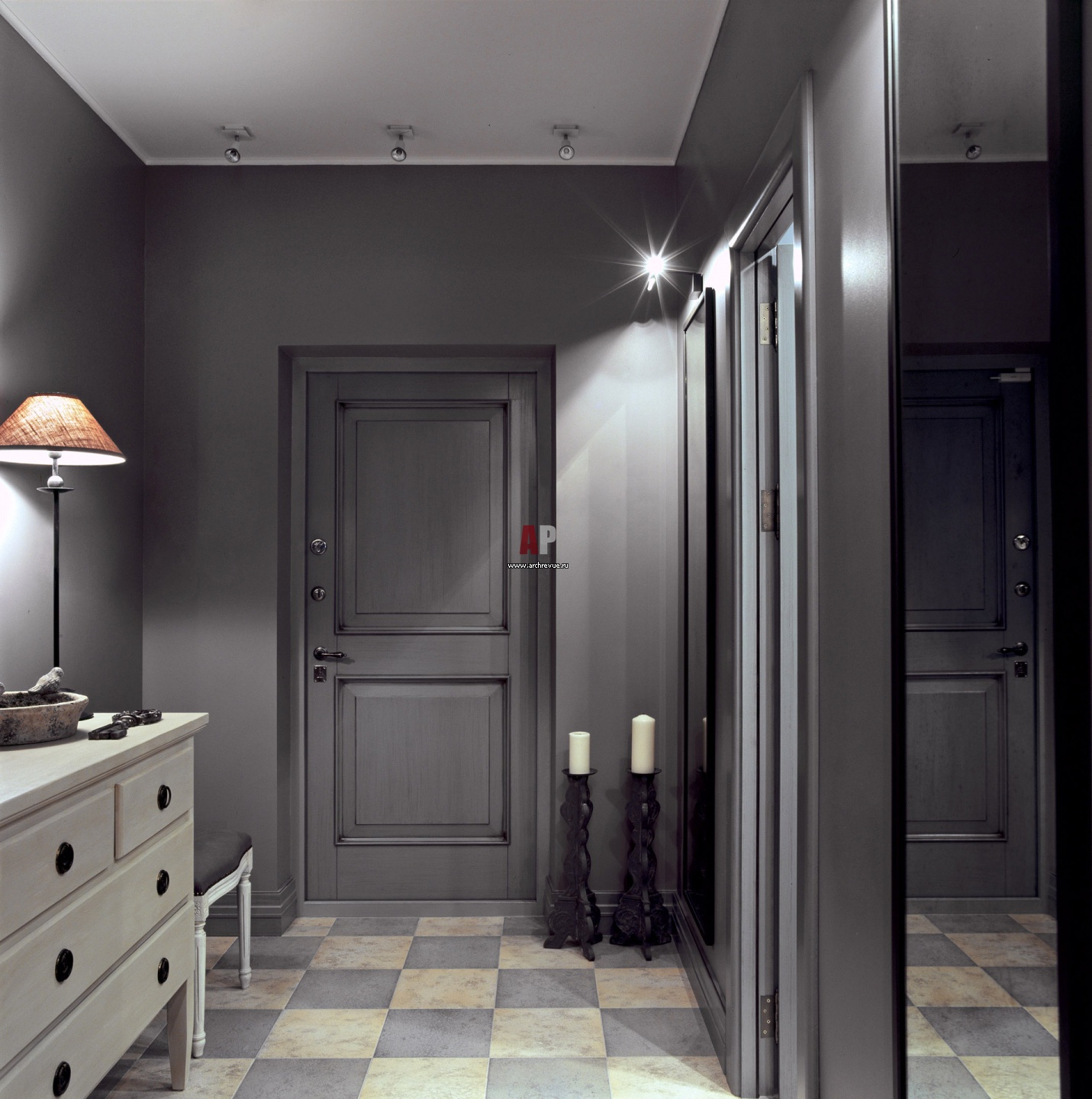 Входная зона в серо-серебристой гамме. Двери и стены одного цветового тона. На полу – раскладка из камня двух оттенков: серебристо-серого и припылено-бежевого.