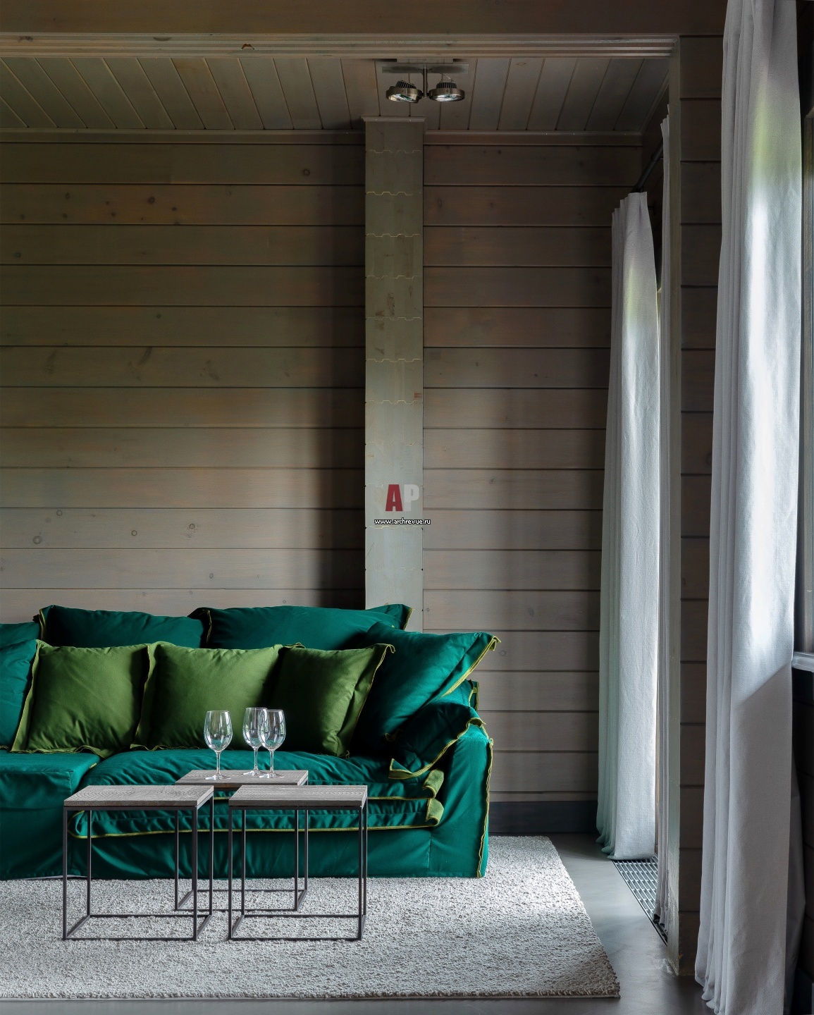 Деревянная усадьба на Алтае. Зона отдыха на первом этаже при сауне. Диван, Linteloo, модель Jan.