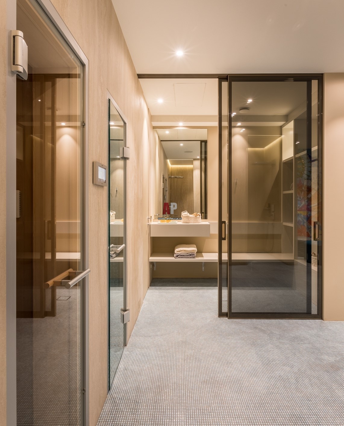 В цоколе спроектирован SPA-комплекс с парилкой, хаммамом, душем для двоих, массажным кабинетом и купелью. Мозаика на полу – Jasba . На стенах – керамогранит, Lamina, он имитирует мрамор Breccia Sarda.