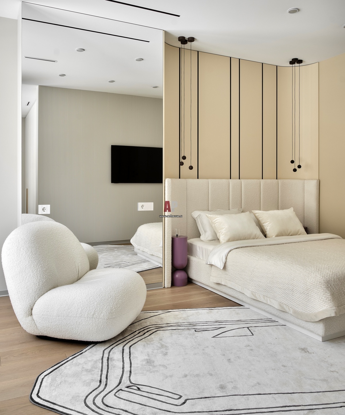 Гостевая спальня выполнена в общей цветовой гамме дома и перекликается с арочным декором гостиной. Цветовая гамма - пастельно-желтый оттенок. С ним контрастирует прикроватная тумба лилового цвета. Ковер необычной формы, с интересной графикой поддерживает орнаментику интерьера: черные вертикальные линии, арочные элементы и плавные, текучие линии. В зеркале отражается отделка стены за ТВ зигзагообразными 3D-панелями.
