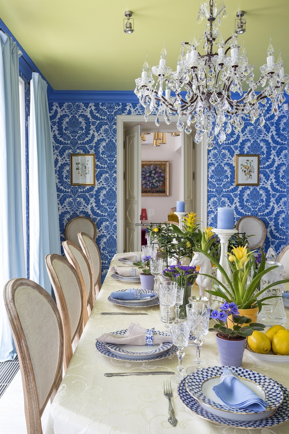 Интерьер столовой в духе современной русской усадьбы. Парадный настрой создают обои Sanderson с крупным бело-синим рисунком. На контрасте со стенами оформлен потолок: он выкрашен в насыщенный лимонный цвет.