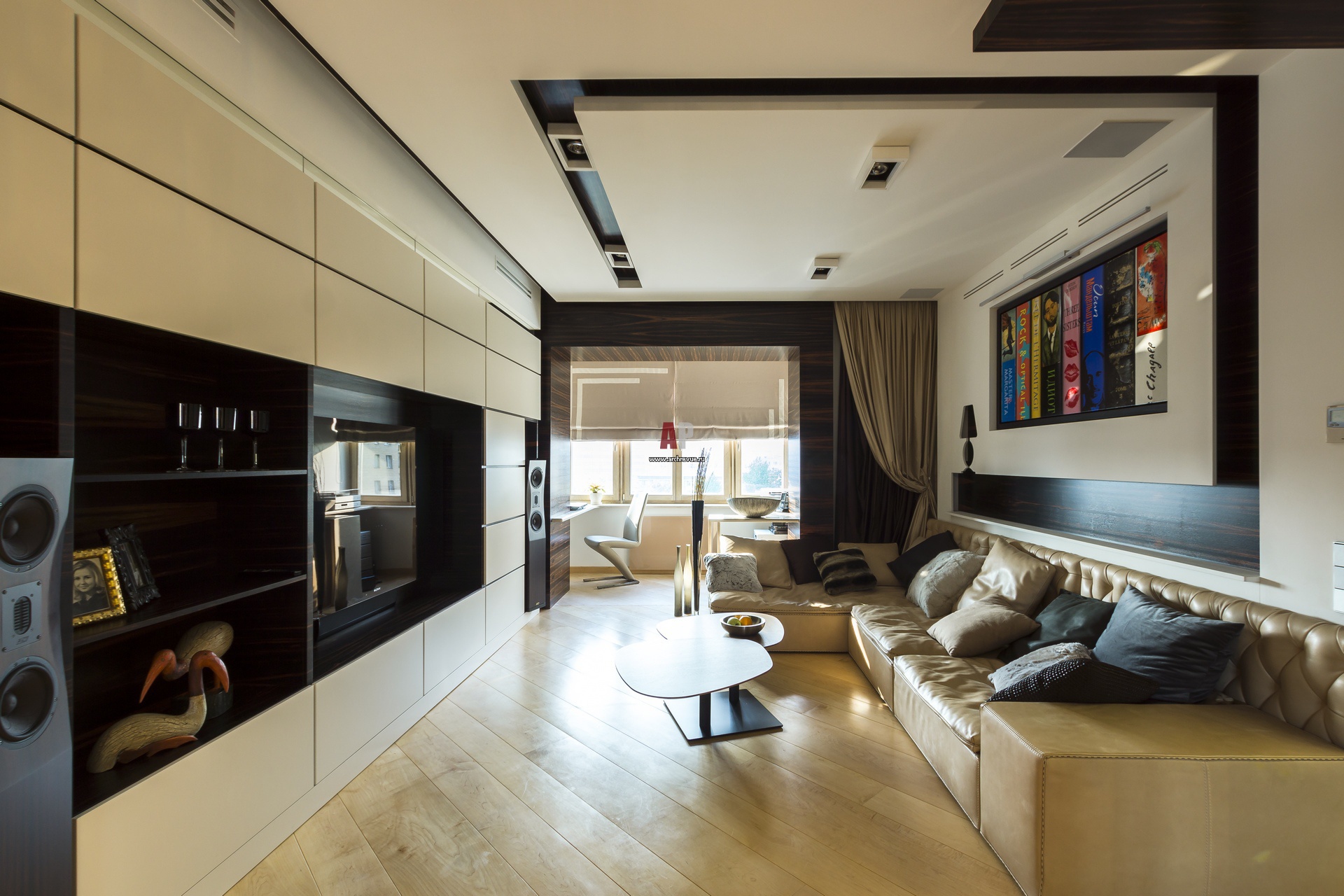 Дизайн современной гостиной в квартире для семьи. Важную роль в облике интерьера играют всевозможные ниши и прорези из темного и светлого дерева и гипсокартона, они проходят по стенам и потолкам и акцентированы встроенной подсветкой.
