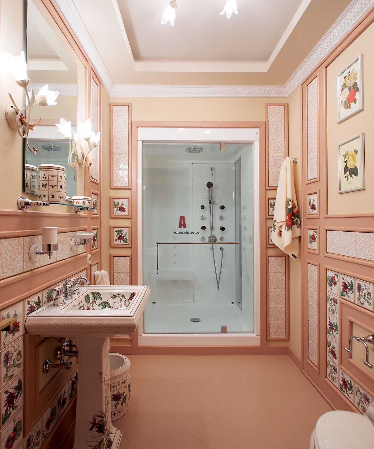 Каждый из 8 санузлов дома выглядит ярко и необычно. Все вместе они вполне могли бы стать иллюстрацией к истории развития стиля ар-деко. Тон в них задает оригинальная сантехника, поставщик «Танит».