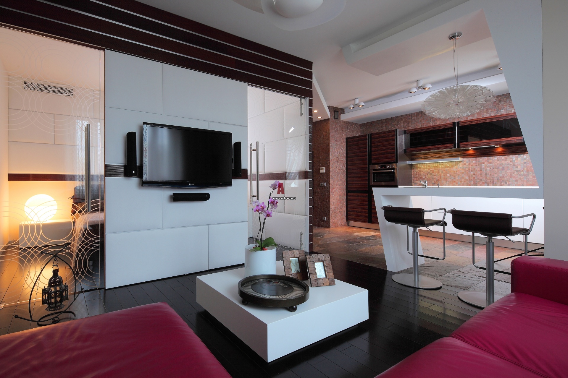 Интерьер квартиры-студии оформлен по принципу люксовых гостиничных апартаментов с изолированной спальней и поворотным экраном ТВ. Стеклянные двери с кругами сделаны на заказ. Центральный модуль зашит прямоугольными кожаными панелями, они смонтированы со сдвигом.