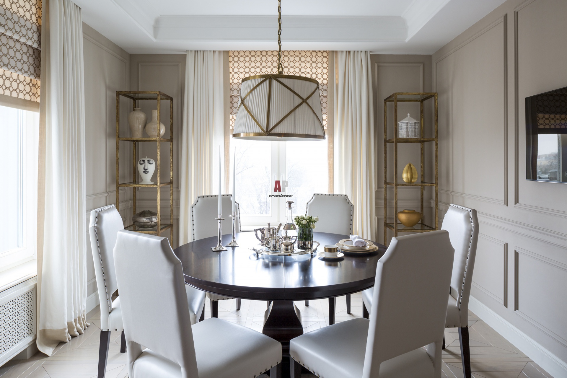 Интерьер парадной столовой. Круглый стол сделан на заказ по эскизам архитектора на итальянской фабрике. Стулья, Andrew Martin. Светильник, Visual Comfort & Co. Вазы, Fornasetti, JL Coquet, Maitland Smith. Сервиз, Donna Karan.