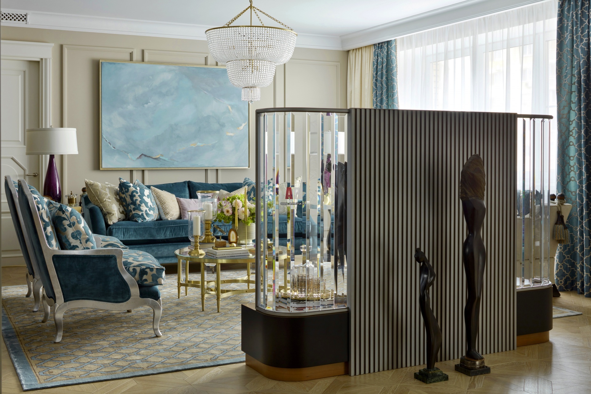 Между гостиной и входной зоной установлена стойка ТВ с боковинами из фацетного стекла. Она сделана на заказ по эскизам дизайнера. Скульптура, L’Appartement.