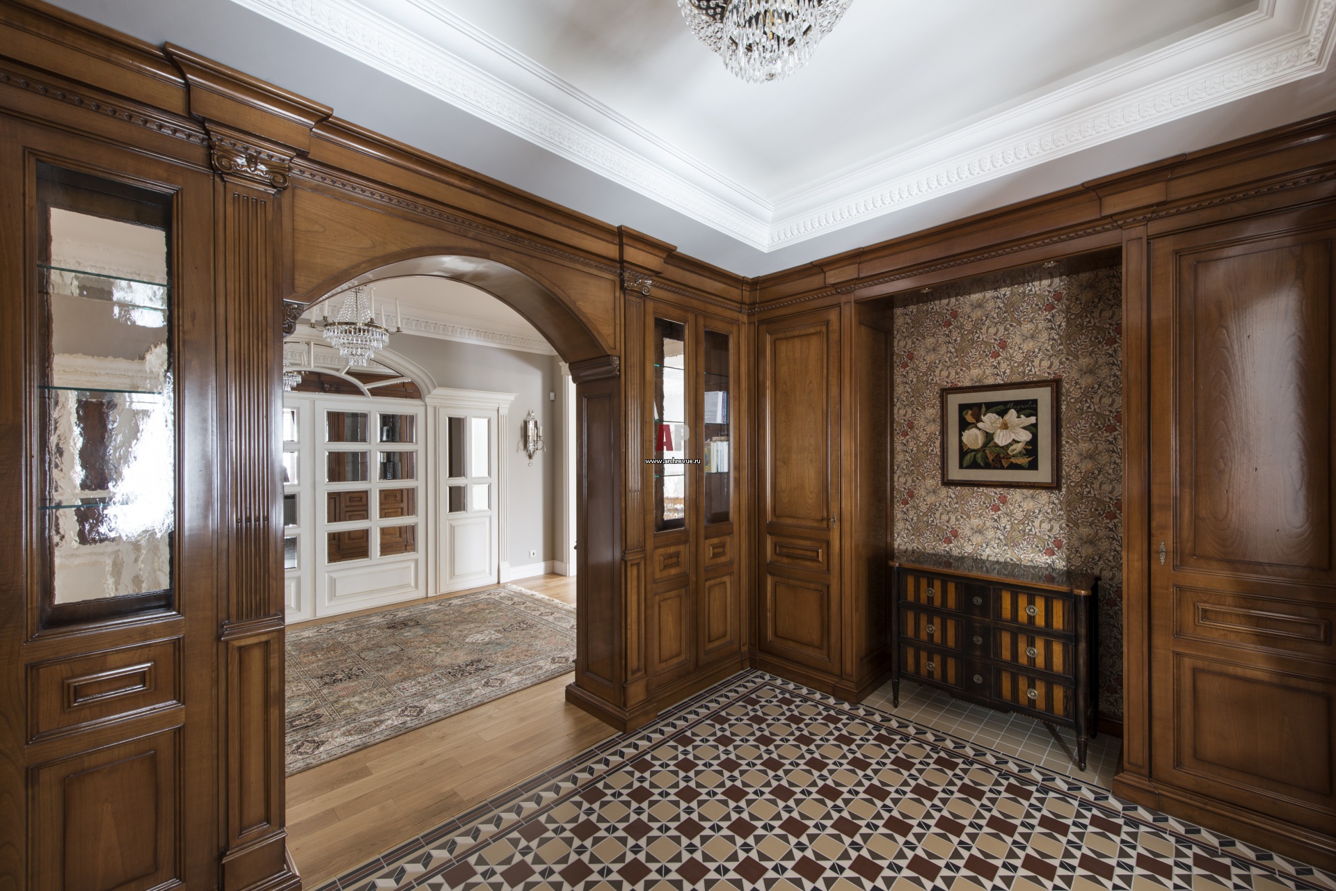Интерьер гардеробной при входе выдержан в английском стиле. Система хранения с арочным проходом, Bizzotto. Английские бумажные обои с цветами на стенах. На полу – панно из плитки TopCer с коричнево-баклажанными деталями.