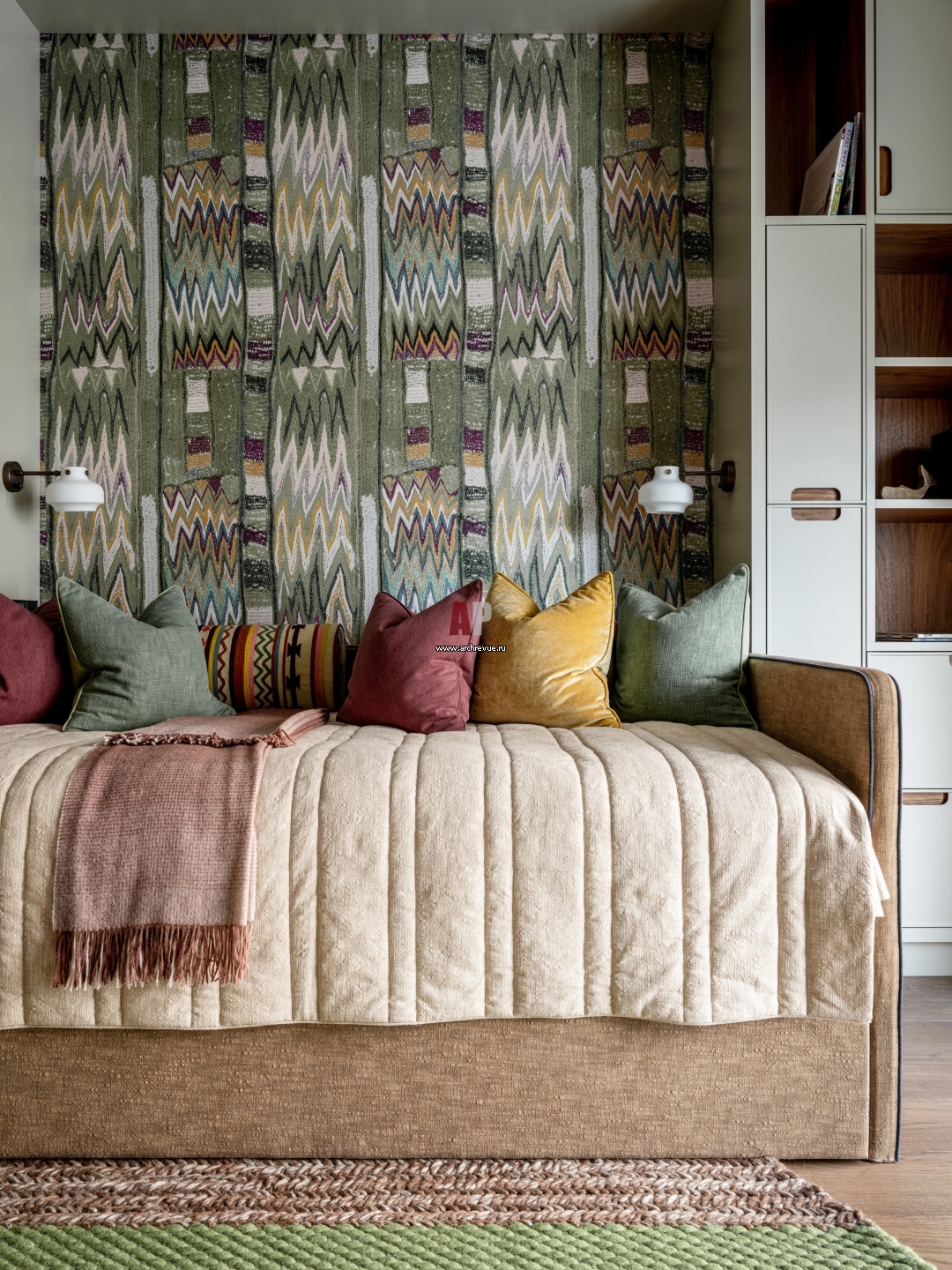 Детская спальня. Кровать в ткани Pierre Frey изготовлена на заказ. Матрас, Vispring. Бра, &Tradition. Обои, Pierre Frey.