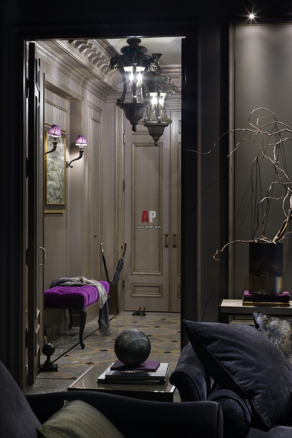 Интерьер парадной прихожей. На одной оси с ней, но в противоположном конце, расположен «черный вход». Стены зашиты деревянными буазери в классическом стиле, за ними скрыта система хранения.