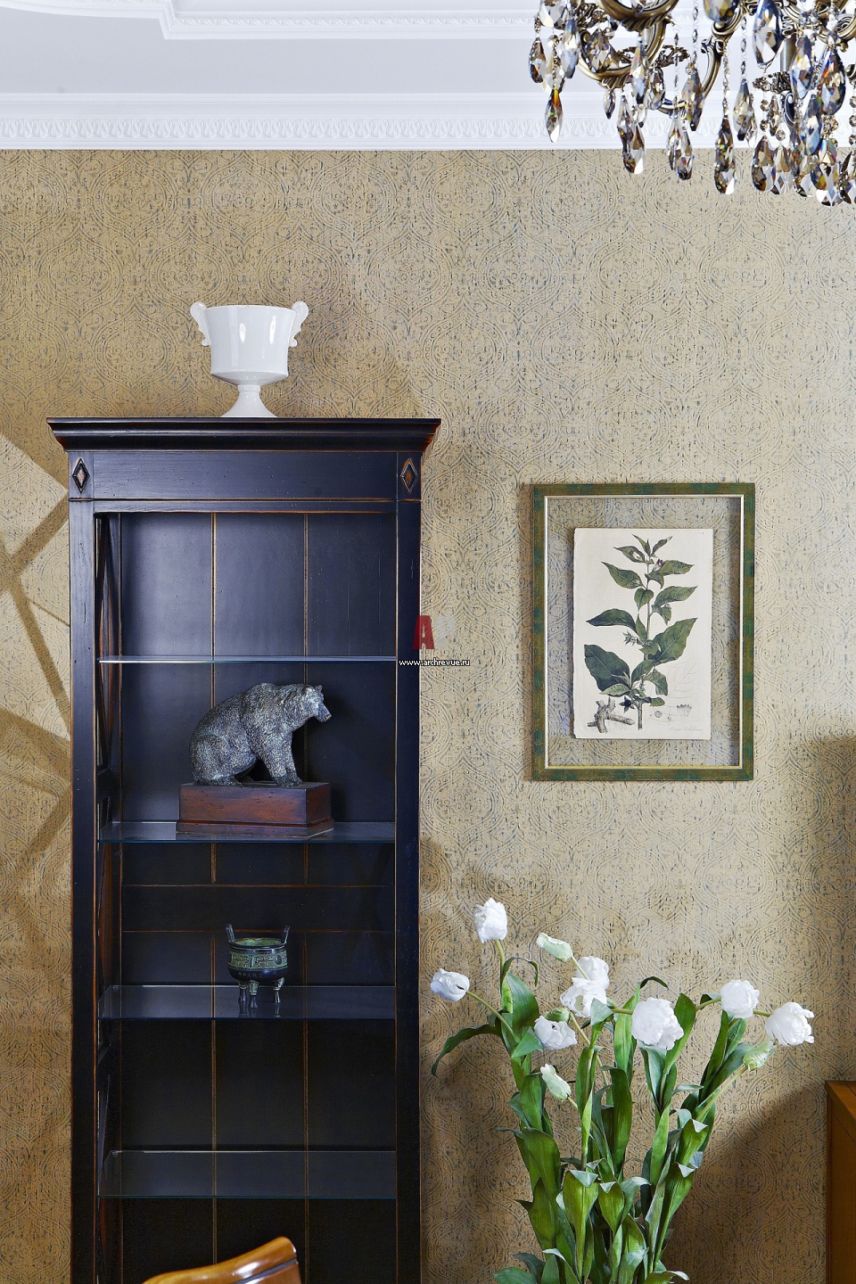Фото интерьера современной классической гостиной. Орнамент бумажных обоев от The Carlisle Company (Англия) напоминает старинную полустершуюся фреску. На ее фоне хорошо работает комод из антрацитового черного дерева.