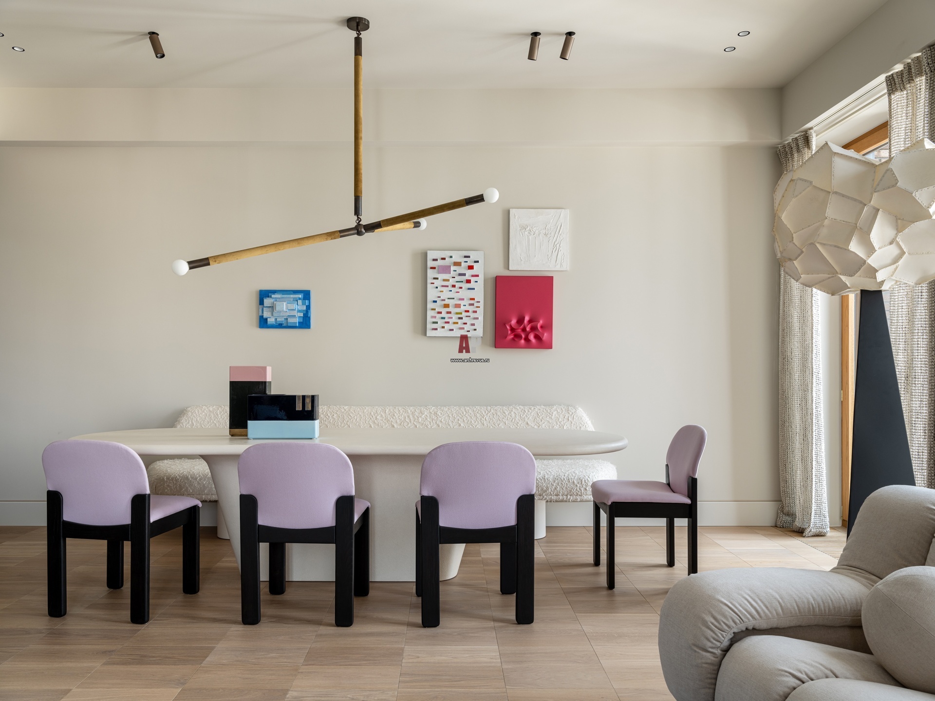 Обеденный стол в отделке микроцементом сделан на заказ. Стулья обеденные в лавандовой обивке, Ernesto Radaelli, винтаж. Скамья-букле, индивидуальное изделие по эскизам дизайнеров. Люстра Apparatus, модель Arrow Large.