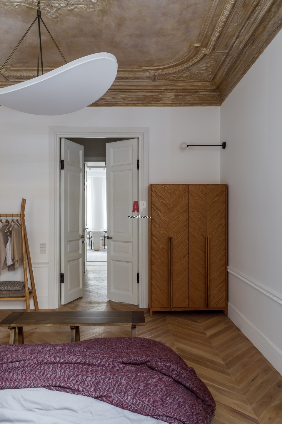 Потолок спальни оформлен самым ранним по времени сохранившимся лепным декором. Реставраторы покрыли исходную грунтовку воском, и получился необычный контраст.