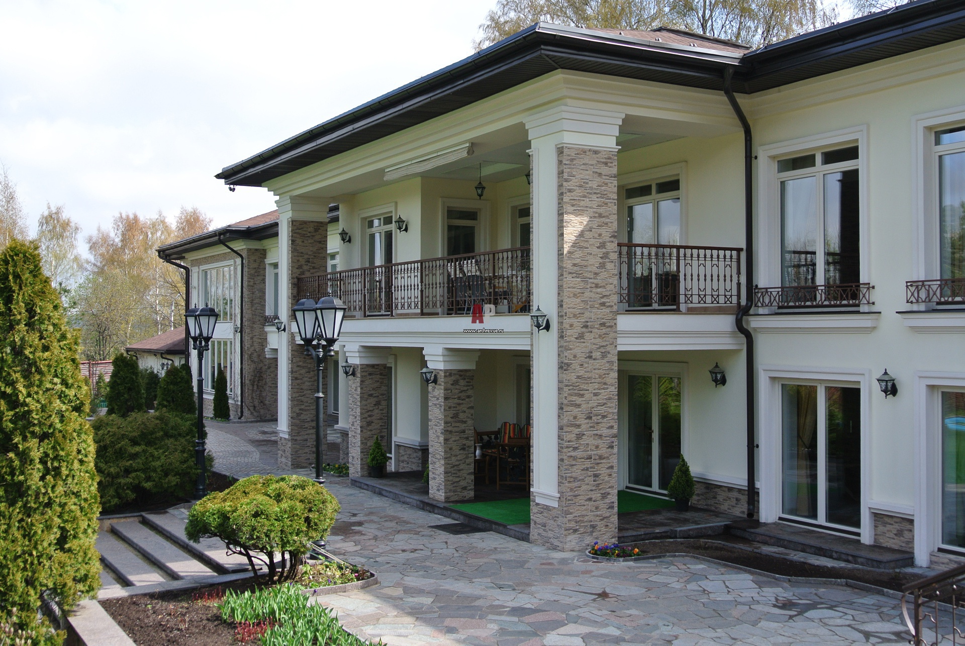 Дизайн фасада двухэтажного особняка с отделкой колонн диким камнем и линией французских балконов с кронштейнами. Также в декорировании экстерьера здания использовались молдинги для наружной отделки.
