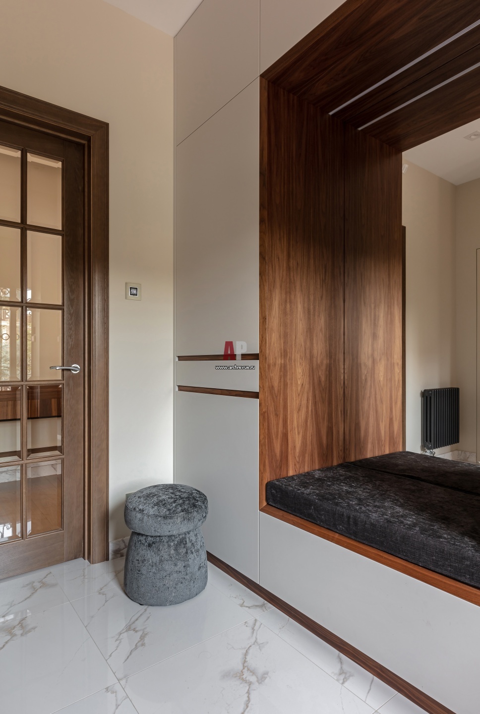 Прихожая с мягкой зоной и встроенным гардеробом.