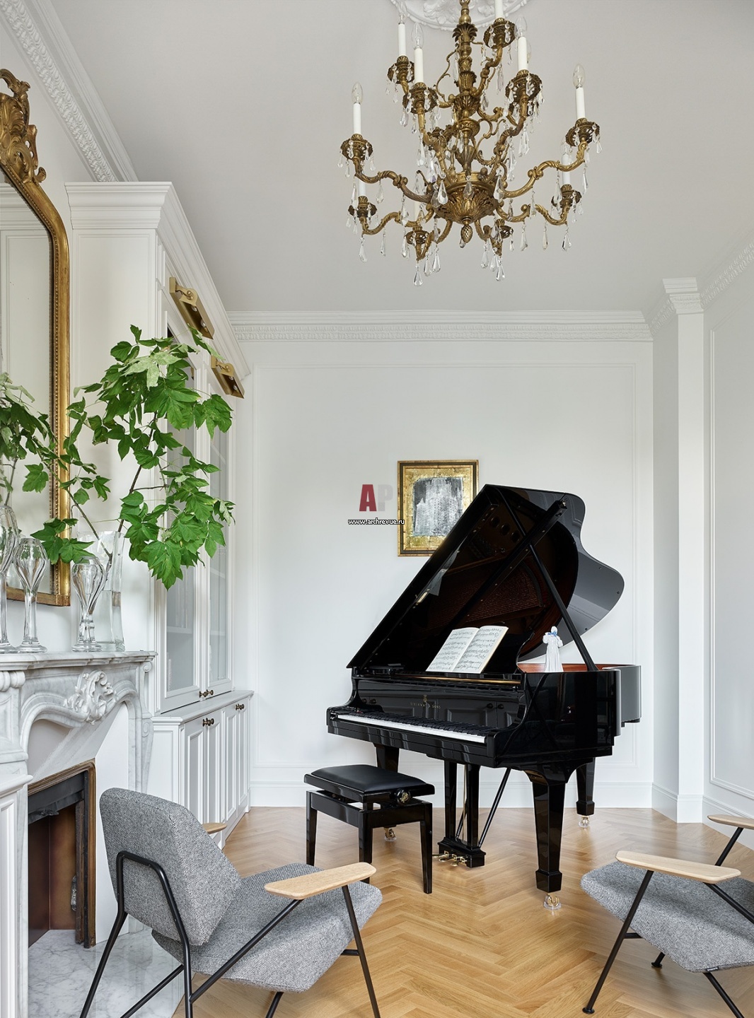 Музыкальный салон. Кресла у камина, Vitra, модель Prostoria Poligon. Рояль, Steinway & Sons.