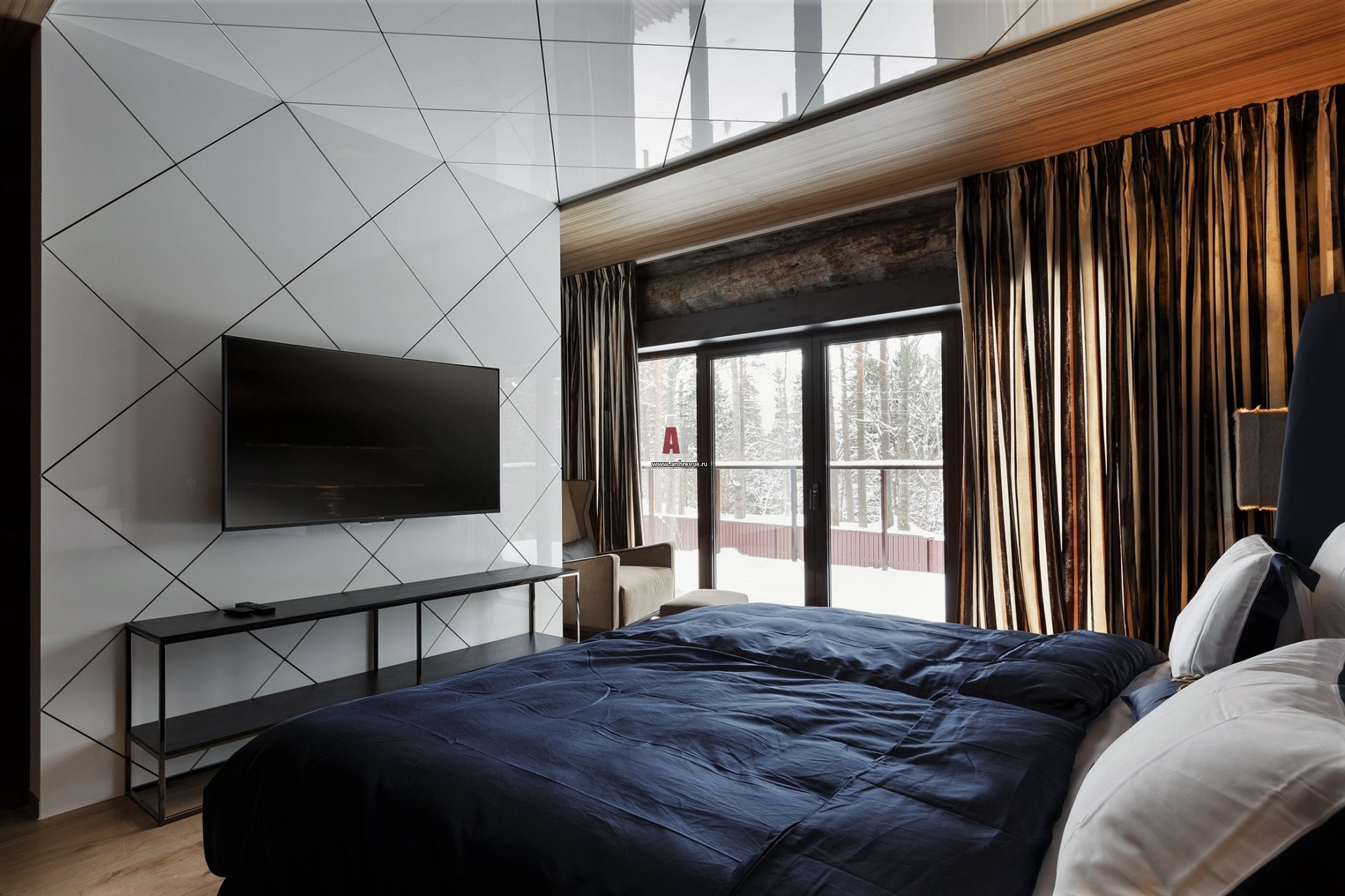 Отправной точкой в развитии интерьера стал орнамент из ромбов, который впоследствии нашел свое отражение в рисунке глянцевых белых панелей перегородки и потолка в мужской спальне.