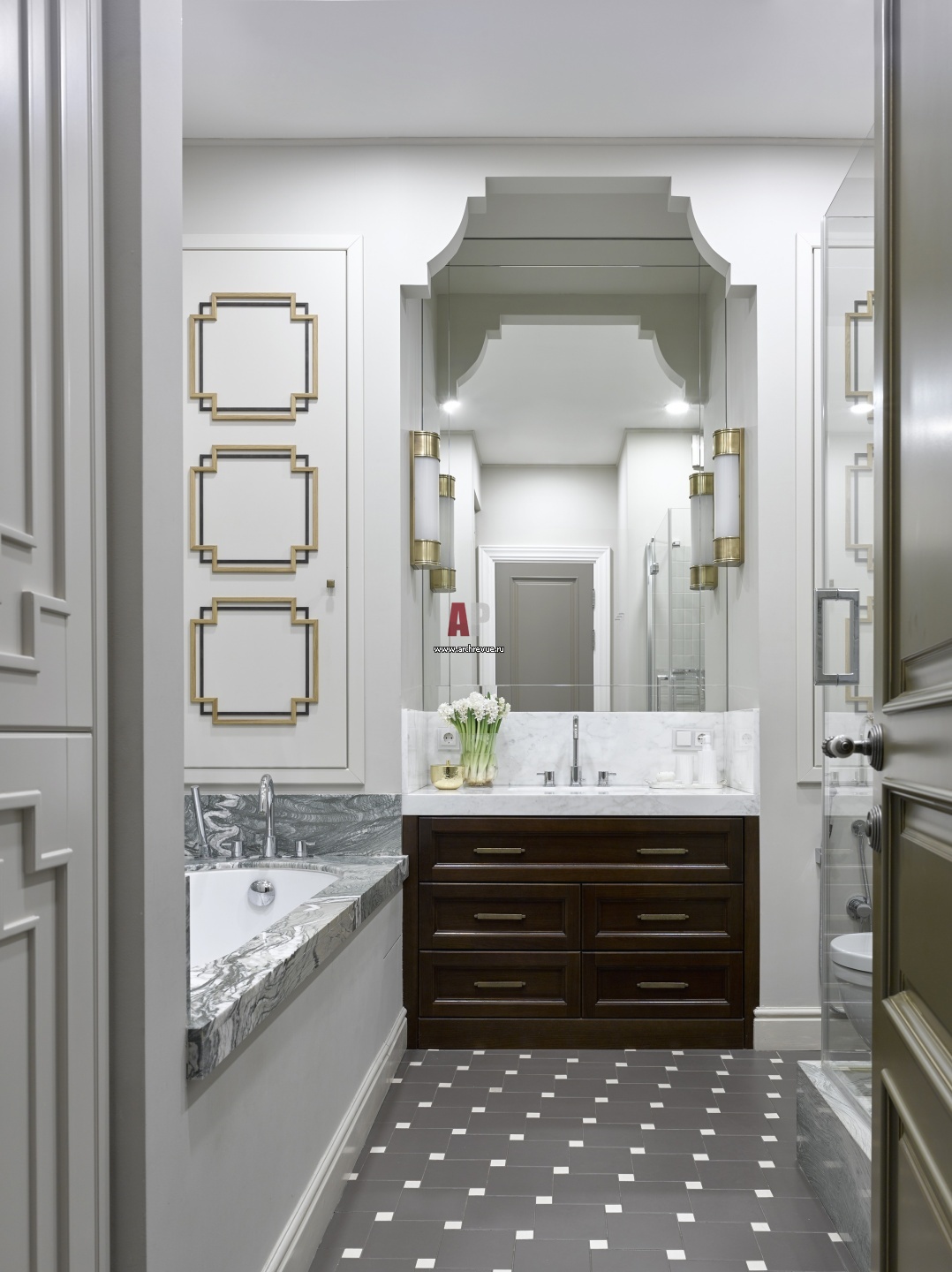 Квартира для мамы с дочерью-студенткой. Интерьер ванной комнаты. На полу – метлахская плитка. Встроенные шкафы, умывальник сделаны на заказ.